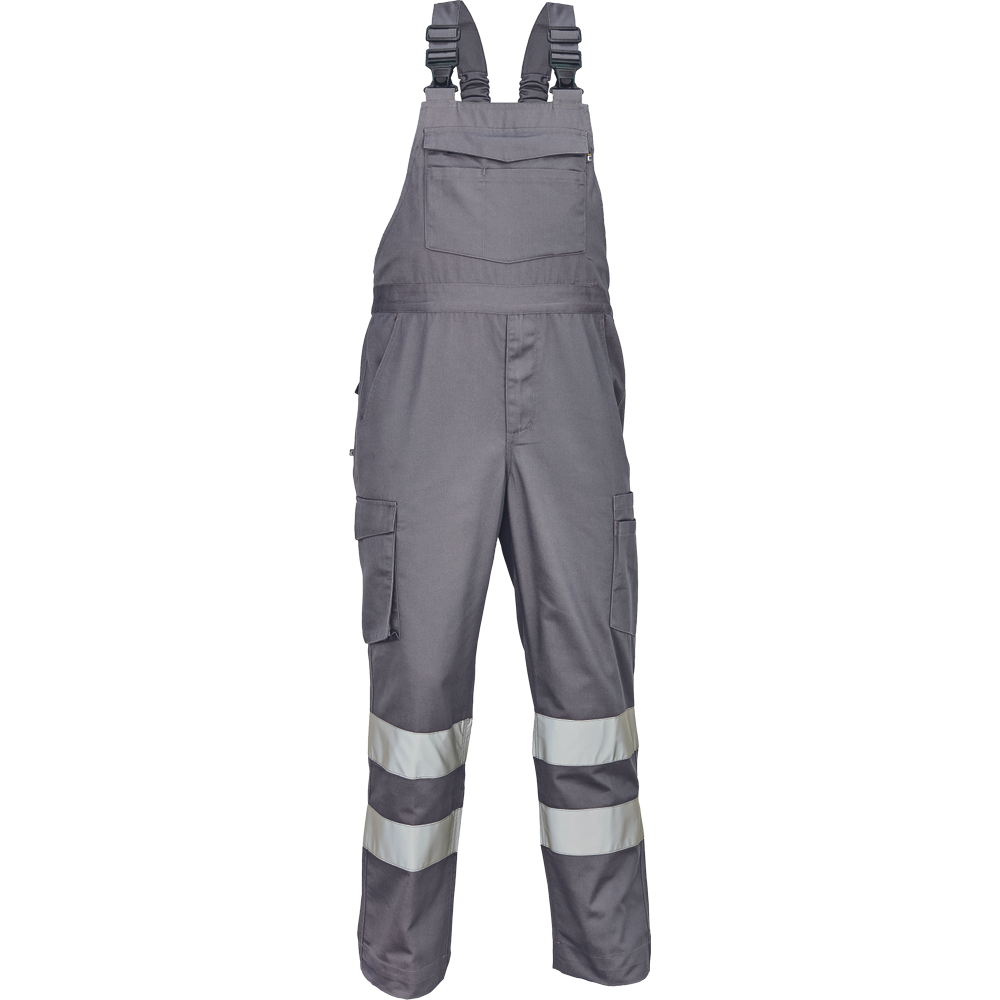 Pánské lehké pracovní kalhoty s laclem a reflexními pruhy na nohavicích, elastický pas; 2 boční kapsy, 1 kapsička na mince; 2 multifunkční stehenní kapsy, 2 zadní kapsy; 1 velká multifunkční náprsní kapsa.