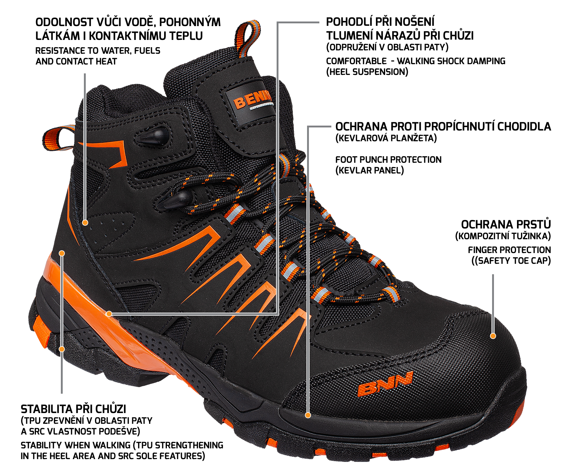 Nemetalická bezpečnostní kotníková obuv v provedení S3, která je odolná vůči vodě, pohonným hmotám i kontaktnímu teplu do teploty 300 °.