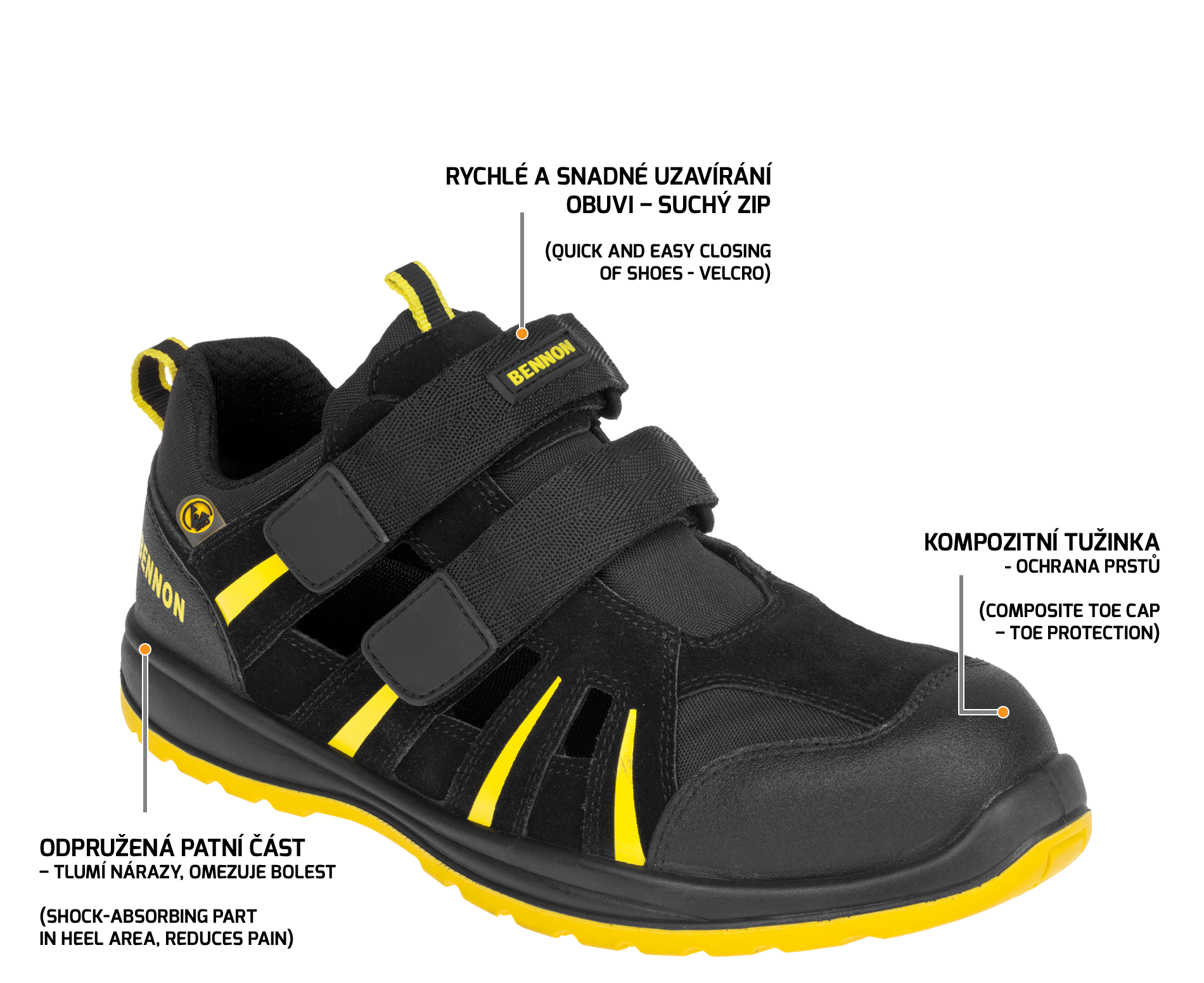 Bezpečnostní nonmetalický sandál je vyroben z kombinace štípené usně a textilie MESH. Uzavírání obuvi je rychlé a snadné, neboť je zde použit suchý zip. Nedílnou součástí této obuvi je taktéž kompozitní tužinka, která ochrání prsty na nohou