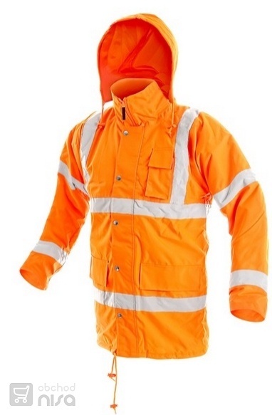 Reflexní, zimní, odolná proti vodě a větru, kapuce v límci, reflexní pruhy, venkovní kapsa na mobil.