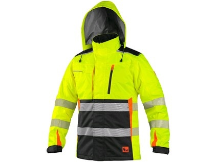 Pánská výstražná zateplená bunda, odolná proti vodě a větru, odepínací kapuce v límci, fleecový límec, regulovatelné manžety na rukávech, kryté zapínání na zip a suché zipy, levá náprsní kapsa na zip, pravá krytá klopou, boční kapsy na zip, segmentov
