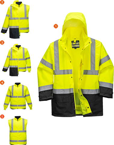 Systém 5v1. Tato stylová bunda je vhodná pro všechny povětrnostní podmínky. Velmi oblíbená pro svoje barevné kombinace, zvýšená viditelnost, voděodolná. Všestranné použití. Bunda obsahuje dvě velké kapsy na suchý zip, skrytou kapuci, v