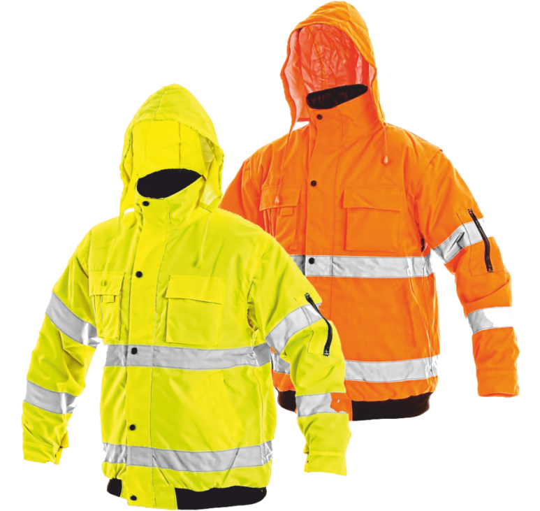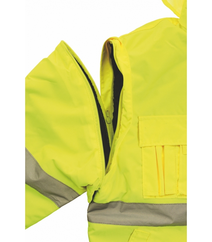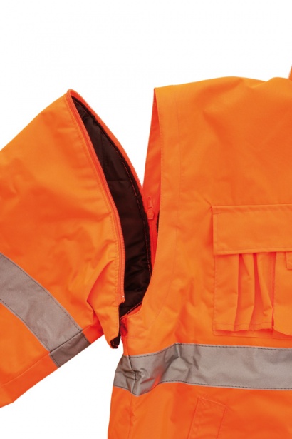 Výstražná bunda, zateplená, 2 v 1, do pasu, odolná proti vodě, odepínací rukávy, kapuce v límci, elastický spodní lem, lepené švy.