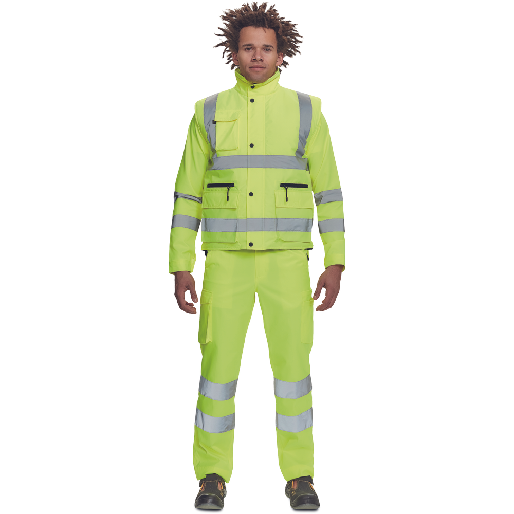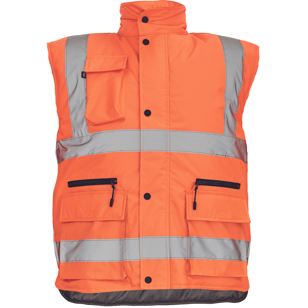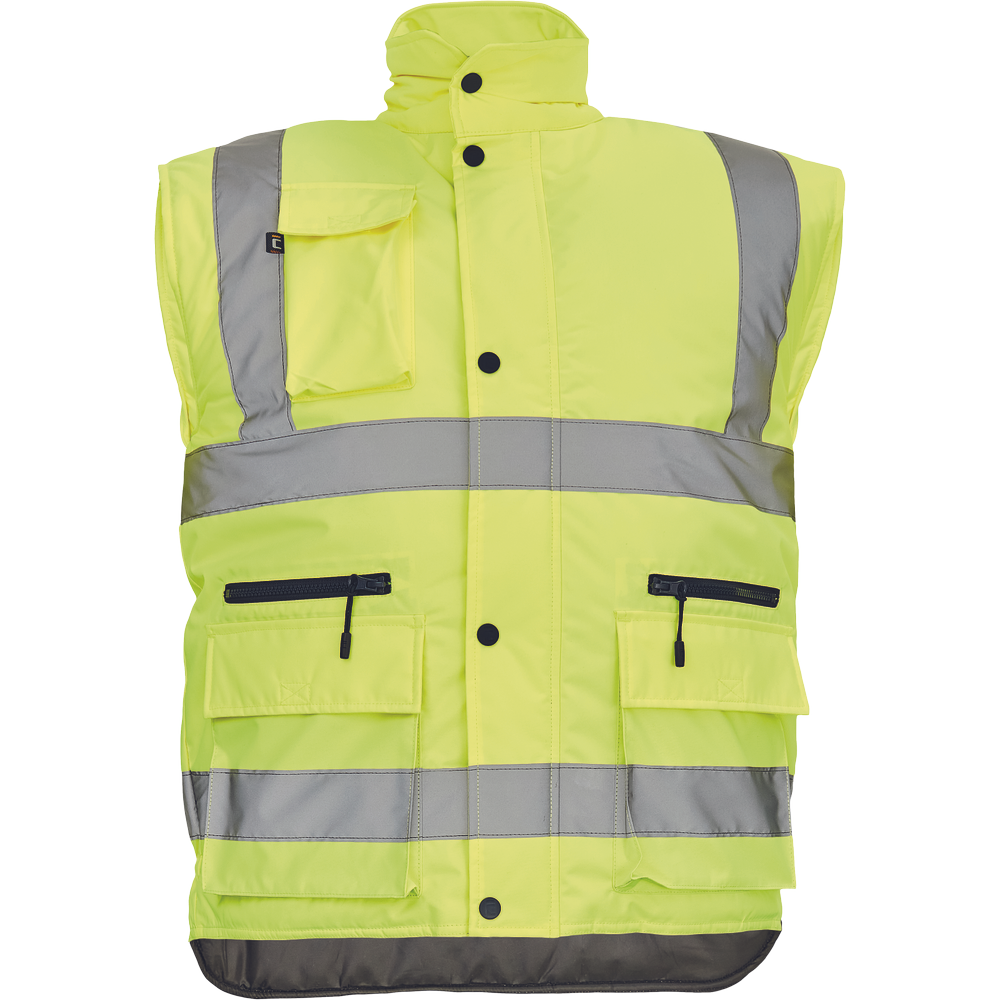 pánská zateplená full Hi-Vis vesta s retroreflexními pruhy přes ramena a v bocích, kapuce skrytá v límci, zapínání na zip kryté légou se zapínáním na druky, 2 přední multifunkční kapsy s klopou a zapínáním na zip, 1