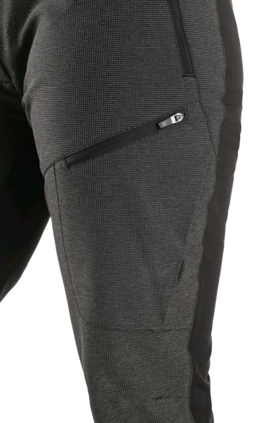 Dámské kalhoty pro volný čas, z kombinovaných materiálů, pevný pas, textilní opasek zapínaný sponou, 2 přední kapsy na zip, 2 šikmé kapsy na zip na stehnech, 1 zadní kapsa.