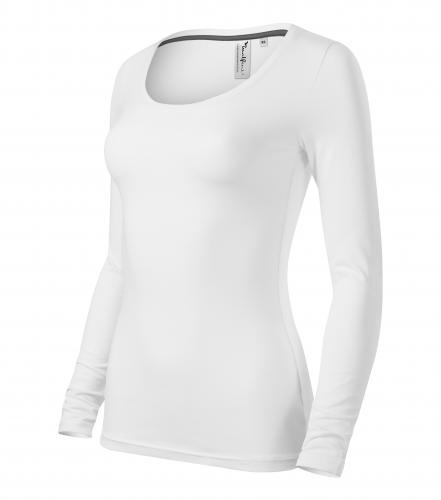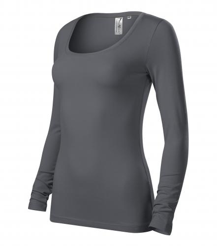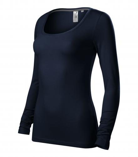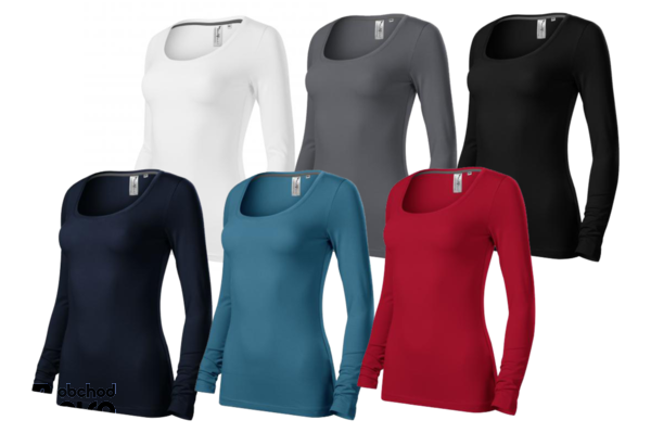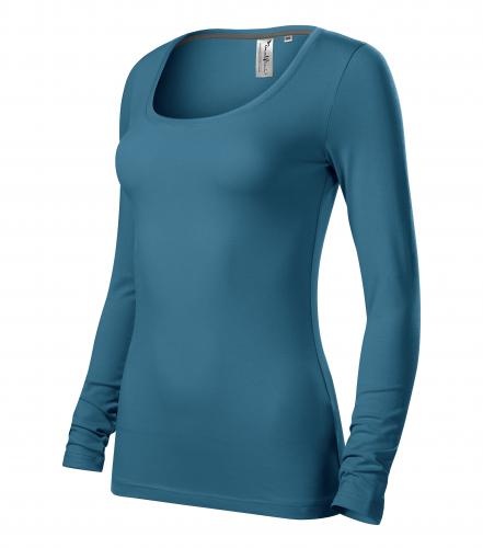 Pohodlné dámské triko s dlouhými rukávy skvěle drží tvar díky přídavku 5 % elastanu. Hlubší kulatý výstřih. Úzký lem průkrčníku z žebrového úpletu 1:1 s 5 % elastanu. Zpevnění ramenních švů páskou.