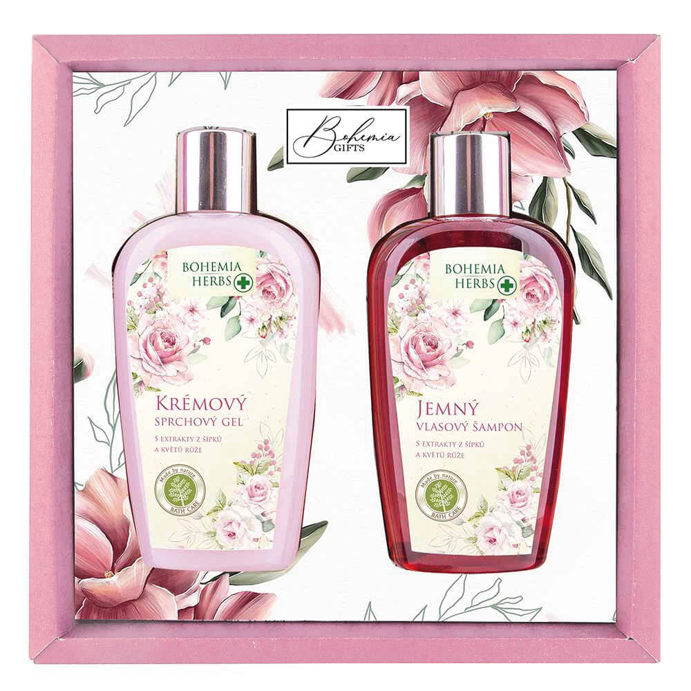 Dárková sada kosmetiky pro ženy s extrakty z šípků a růže obsahuje sprchový gel 250 ml a vlasový šampon 250 ml. Kosmetika je obohacena o kosmetický olivový olej a kvalitní extrakty z plodů šípku a květů růže.