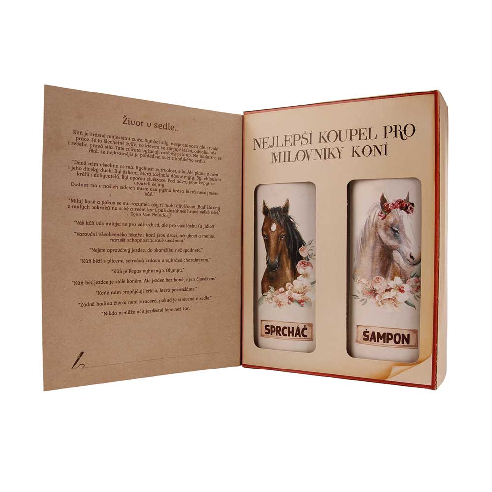 Kosmetický balíček určitě potěší všechny, kdo mají koně ve svém srdci. Originální kosmetická sada obsahuje sprchový gel a vlasový šampon. Netradiční kosmetický dárek pro každého milovníka koní.