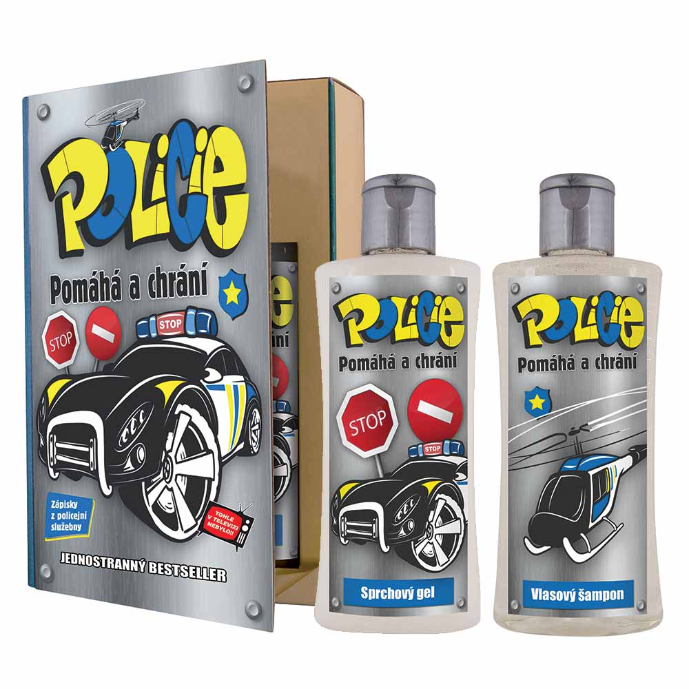 Dárkové balení kosmetiky pro policisty. Kosmetický balíček v netradičním balení – kniha – obsahuje sprchový gel a vlasový šampon. Po odklopení přední strany krabičky si můžete přečíst několik krátkých plicejních vtipů. Krásný originální dárek pro muže.