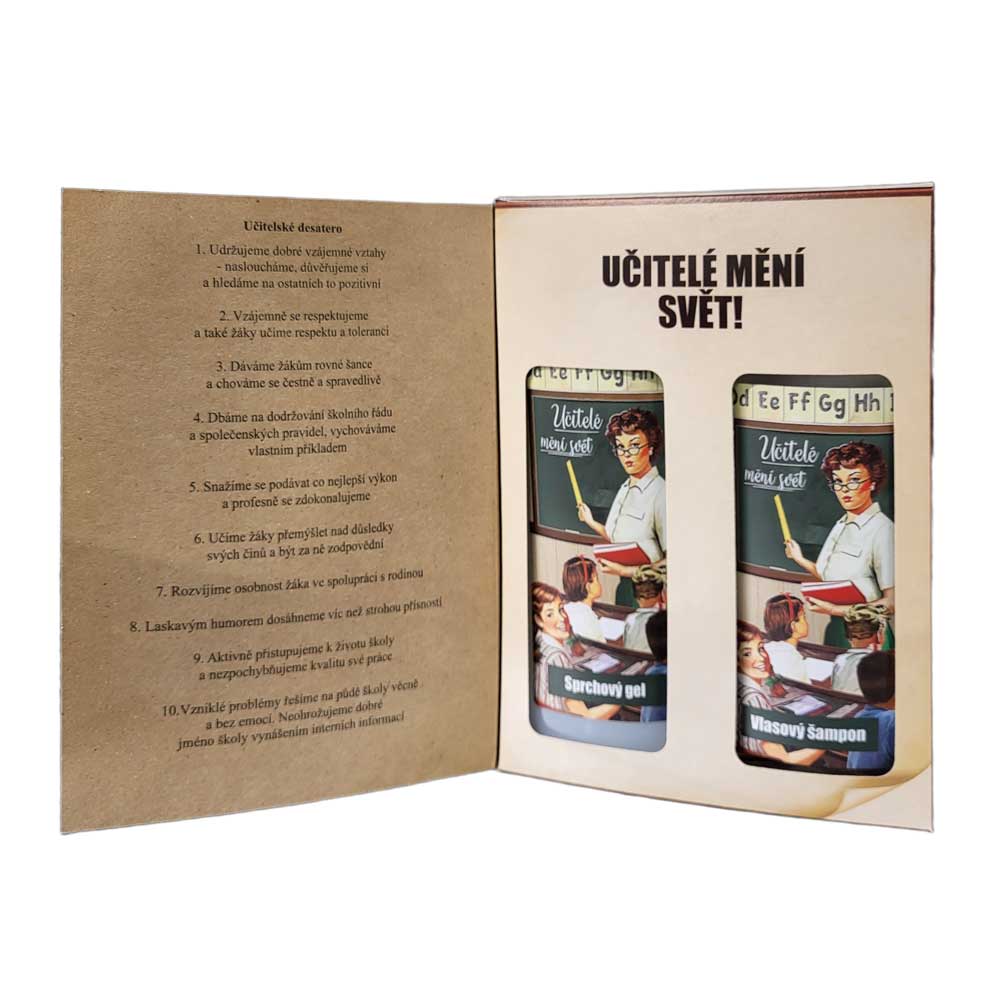 Dárkové balení kosmetiky pro učitele – učitel mění svět. Kosmetický balíček v netradičním balení – kniha – obsahuje sprchový gel a vlasový šampon. Po odklopení přední strany krabičky si můžete přečíst několik krátkých učitelských vtipů.