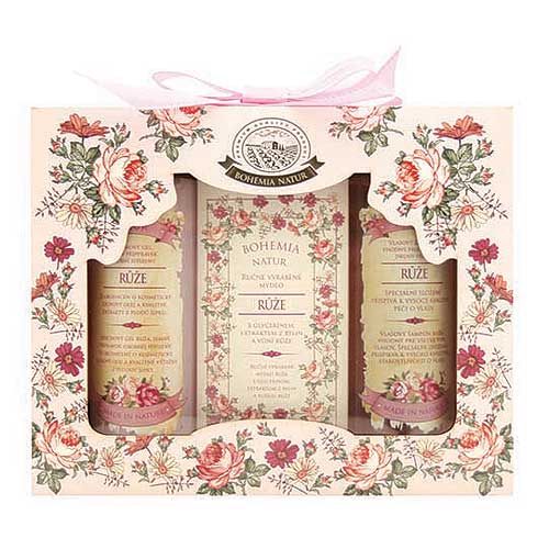 Dárkové balení růžové kosmetiky s extrakty z šípků a květů růže. Originální dárková sada kosmetiky složená ze sprchového gelu 100 ml, toaletního mýdla 100 g a vlasového šamponu 100 ml. Skvělý dárek pro ženy.