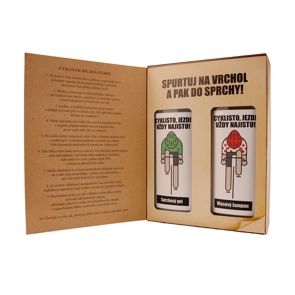 Dárkové balení kosmetiky – pro cyklistu. Kosmetický dárkový balíček – sprchový gel 250 ml a vlasový šampon 250 ml s olivovým olejem – v netradičním balení – kniha pro cyklistu. Po odklopení přední strany krabičky si můžete přečíst několik krátkých cyklist