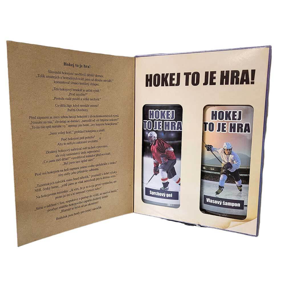 Originální dárek pro hokejistu. Kosmetický dárkový balíček obsahuje sprchový gel a vlasový šampon s olivovým olejem. Sada v provedení kniha, po odklopení přední strany krabičky si můžete přečíst několik krátkých hokejových vtipů.