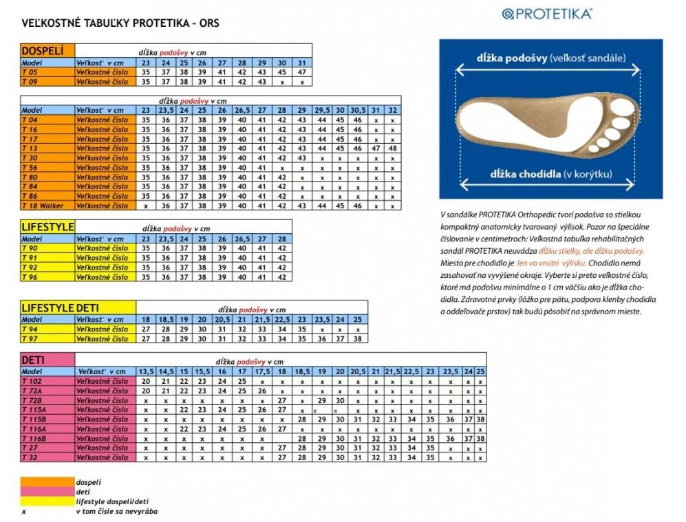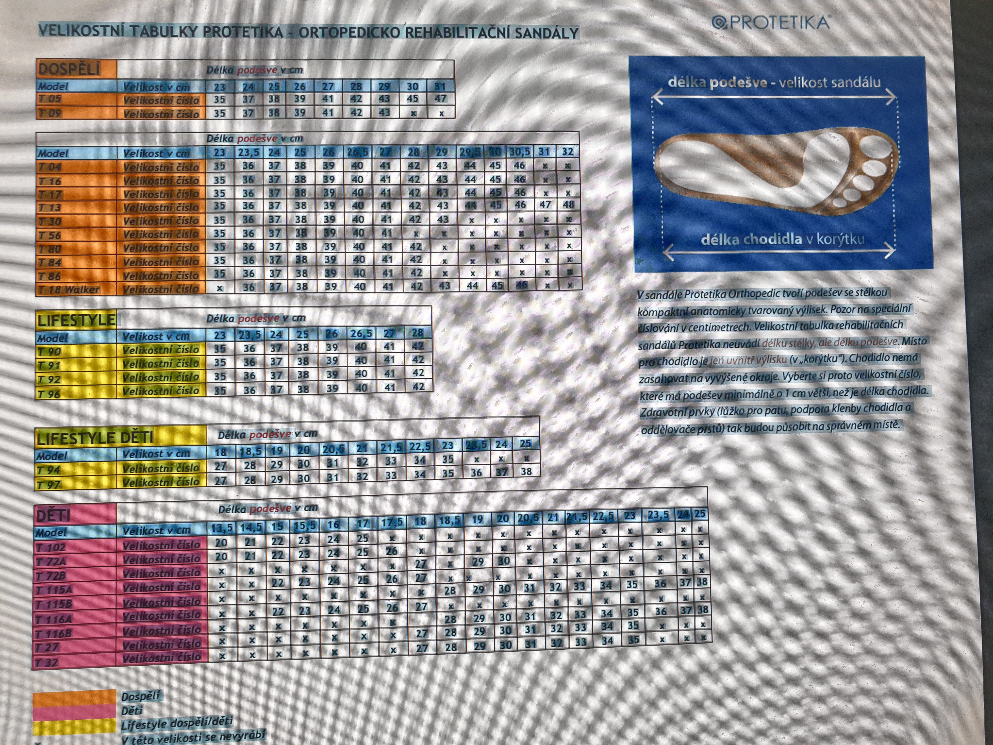 Při výběru velikosti obuvi Protetika věnujte zvláštní pozornost naší doporučené velikosti. Díky specifické konstrukci obuvi Protetika, která zahrnuje hlubší zapuštění patní části, doporučujeme zakoupit obuv o velikost větší než je vaše standardní velikost. Tím zajistíte maximální pohodlí a komfort při nošení. Tabulka velikosti ZDE