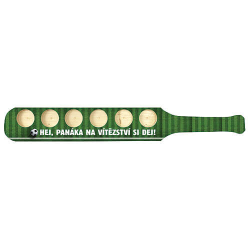 Dřevěný stojan na skleničky na alkohol s potiskem pro fotbalisty -hej, panáka na vítězství si dej. Praktický držák na servírování panáků při společných oslavách a pro zapití vyhraného zápasu.