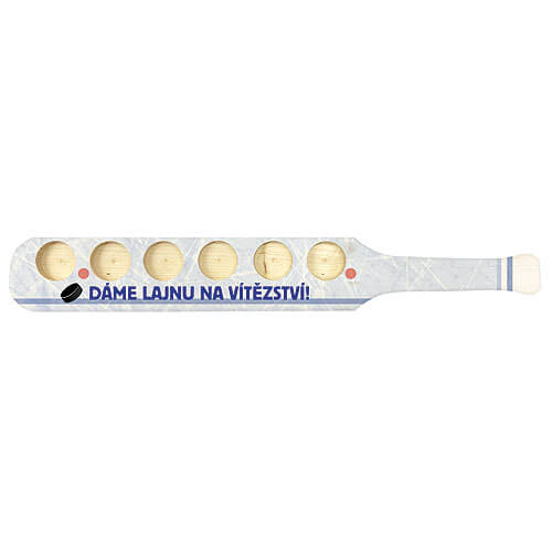 Dřevěný stojan na skleničky na alkohol s potiskem pro hokejisty – Dáme lajnu na vítětství. Praktický držák na servírování panáků při společných oslavách a oslavě hokejových úspěchů.