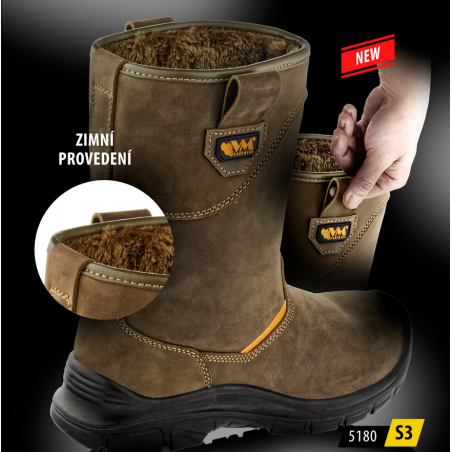 Kvalitní profesionální pracovní zimní obuv z hovězí usně s hydrofobní úpravou. Precizní šití, ocelová tužinka na ochranu špice a planžeta.