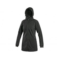 Dámský softshellový kabát s odepínací kapucí, odolný proti vodě a větru, zapínaní na zip, rukávy s vnitřními manžetami, stahování v dolním okraji, spodní kapsy na zip, relfexní doplňky.
