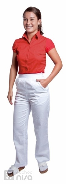 Dámské kalhoty, pevný pas, boční zapínání na knoflíky, v zadní části poutka s knoflíky na stáhnutí.
