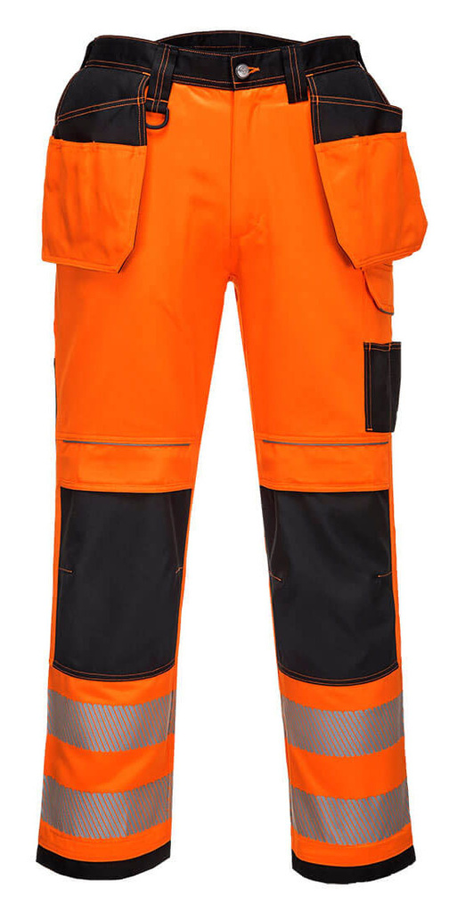 Inovativní hi-vis strečové kalhoty využívající vysoce výkonnou oboustrannou strečovou tkaninu pro maximální rozsah pohybu při práci. Mezi chytré funkce patří multifunkční kapsy pouzdra, kapsy na kolena s horním plněním a snadno přístupná vícecestná stehenní kapsa pro bezpečné uložení telefonu, klíčů a nástrojů. Zesílení z oxfordské textilie v klíčových bodech oděru a trojité prošívání pro maximální odolnost.