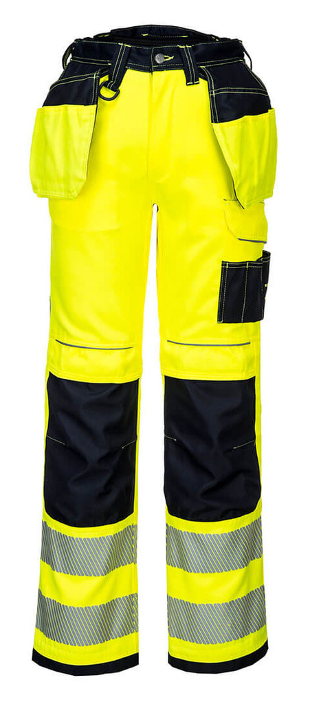 Inovativní Hi-Vis strečové kalhoty využívající vysoce výkonnou oboustrannou strečovou tkaninou pro maximální rozsah pohybu při práci.