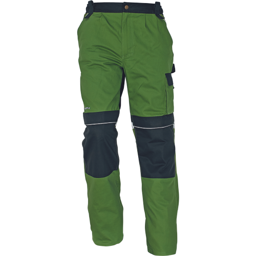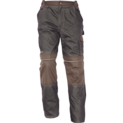 Pracovní kalhoty vysoké odolnosti, elastický pas; kovové zipy a druky zapínání; 5 fukčních kapes; zesílená kolena s kapsami na vkládání nákoleníků; reflexní doplňky.