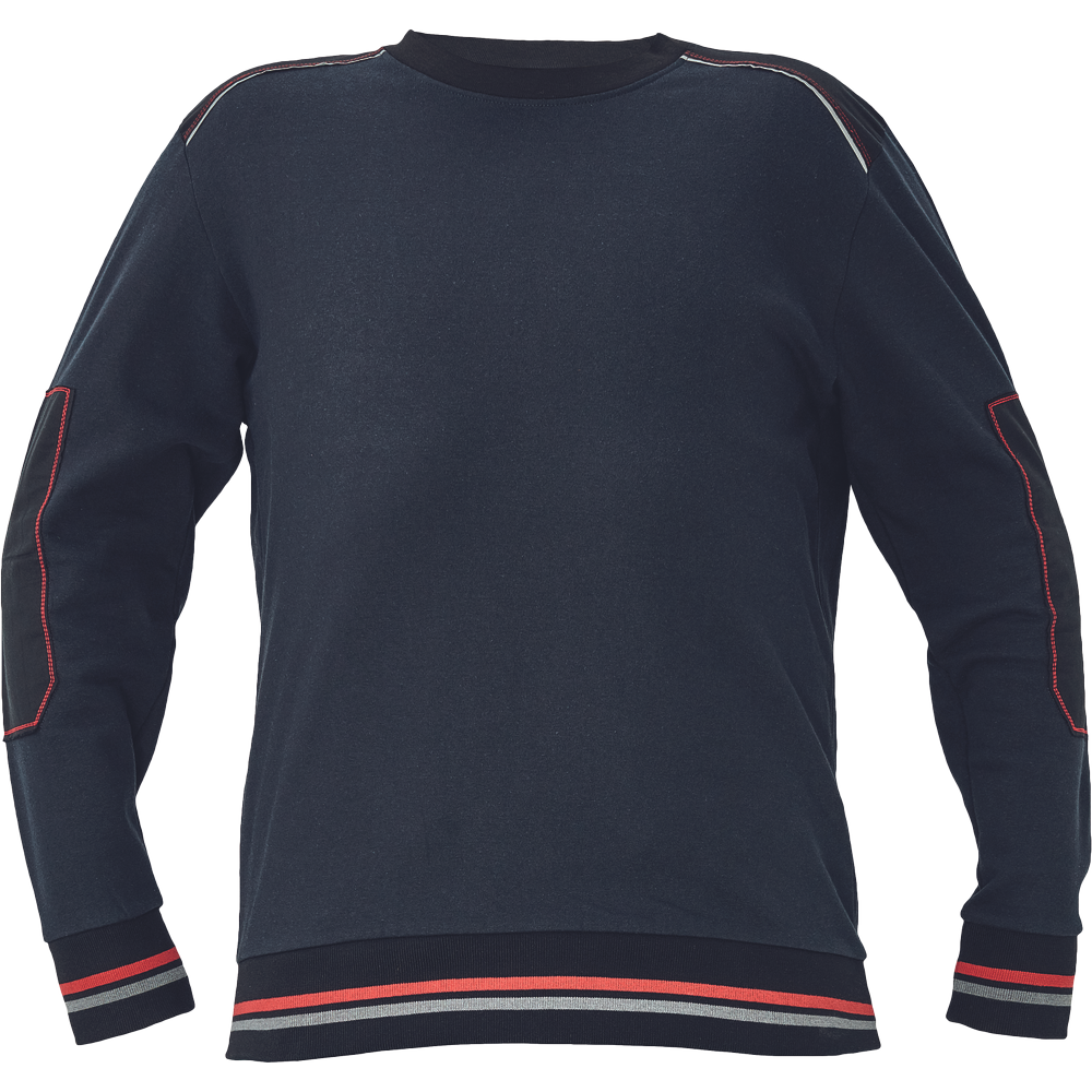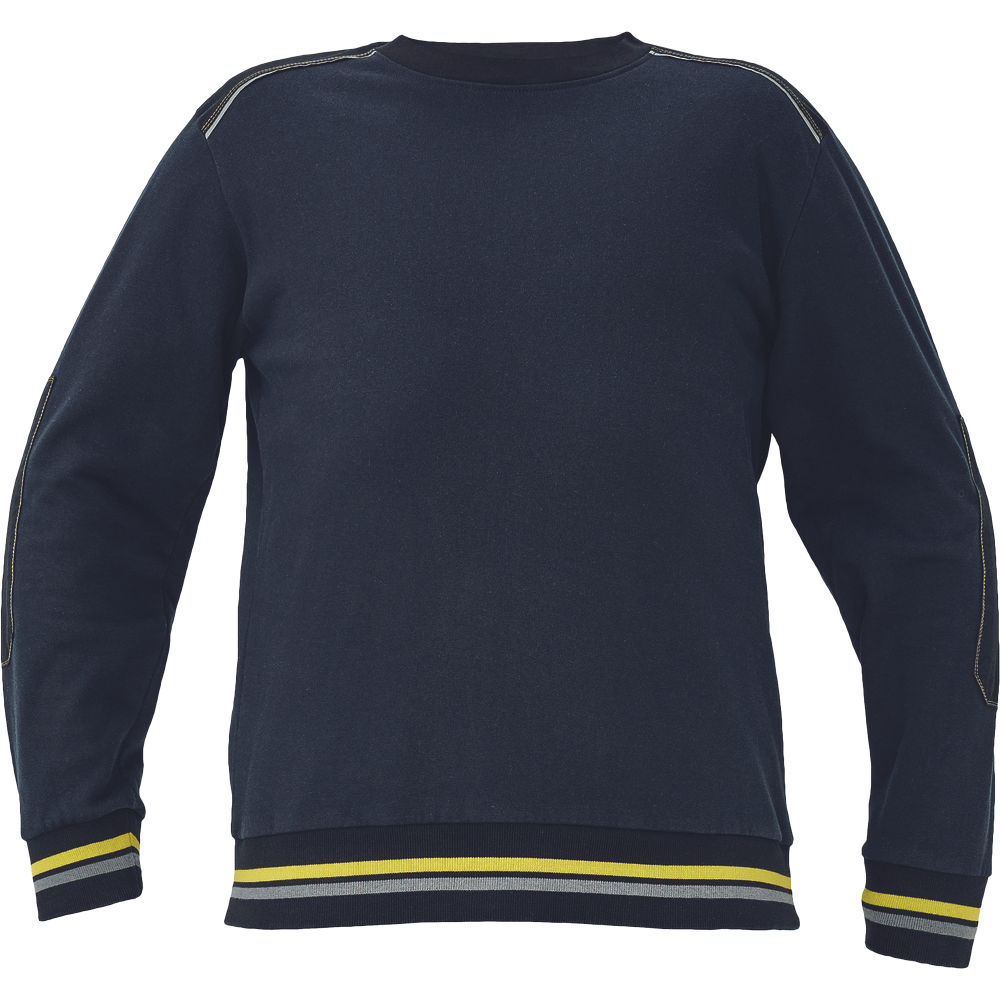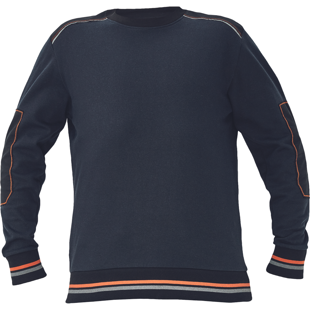 Mikina s kulatým průkrčníkem, z počesaného výplňku směsi bavlny a polyesteru; sedlo v kontrastní černé barvě lemované reflexní paspulkou; zesílená oblast loktů; kontrastní proužky v nápletech, na rukávech a spodním lemu; dekorativní prošití v HI-VIS barvě.