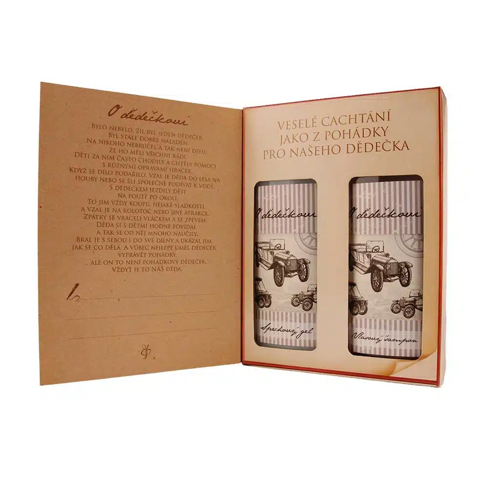 Dárkové balení kosmetiky pro dědečka v provedení kniha – pohádka o dědečkovi. Kosmetický dárkový balíček obsahuje sprchový gel 250 ml a vlasový šampon 250 ml pro dědečka. Po odklopení přední strany krabičky si můžete přečíst krátkou pohádku o dědečkovi.