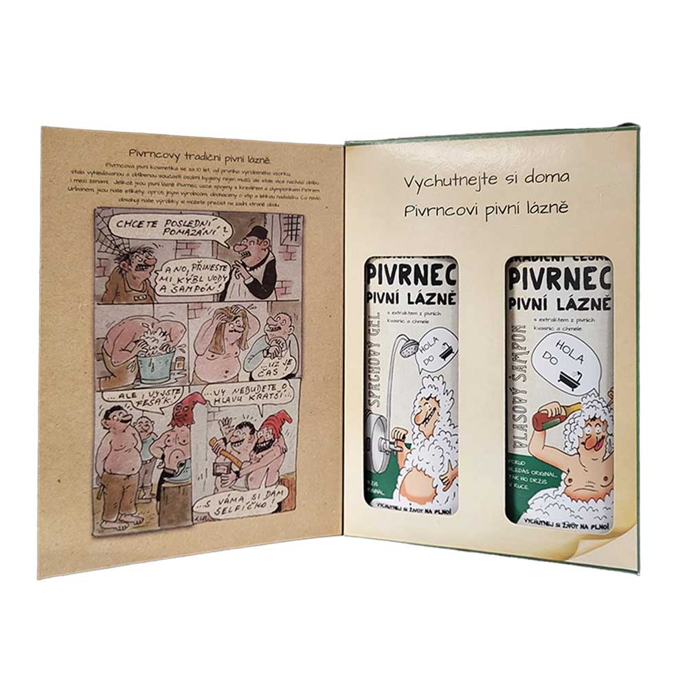 Pivrnec dárkové balení pivní kosmetiky s extrakty z pivních kvasnic a chmele v provedení kniha – sprchový gel 250 ml a vlasový šampon 250 ml. Obrázky pro pivní kosmetiku vytvořil známý kreslíř Petr Urban.
