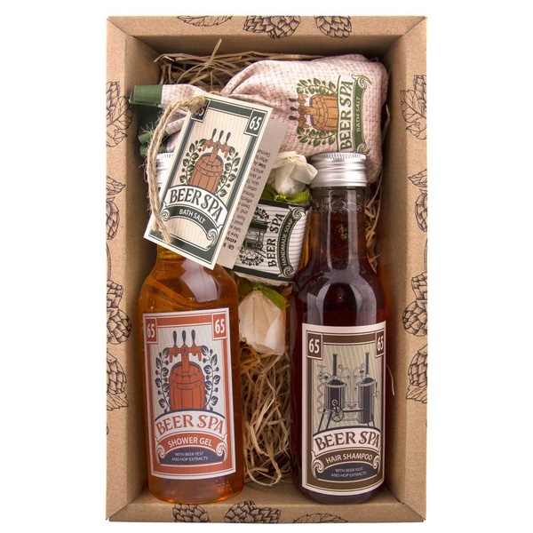 Dárkový kosmetický balíček pivní kosmetiky Beer Spa obsahuje sprchový gel 200 ml, koupelová pěna 200 ml, toaletní mýdlo 30 g a koupelová sůl 150 g.