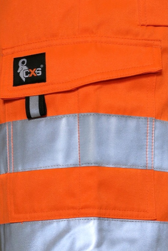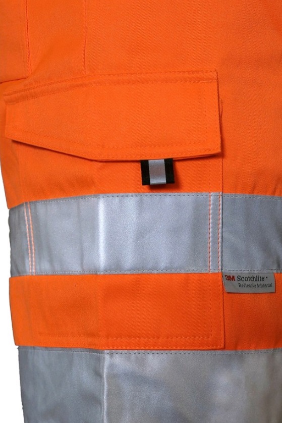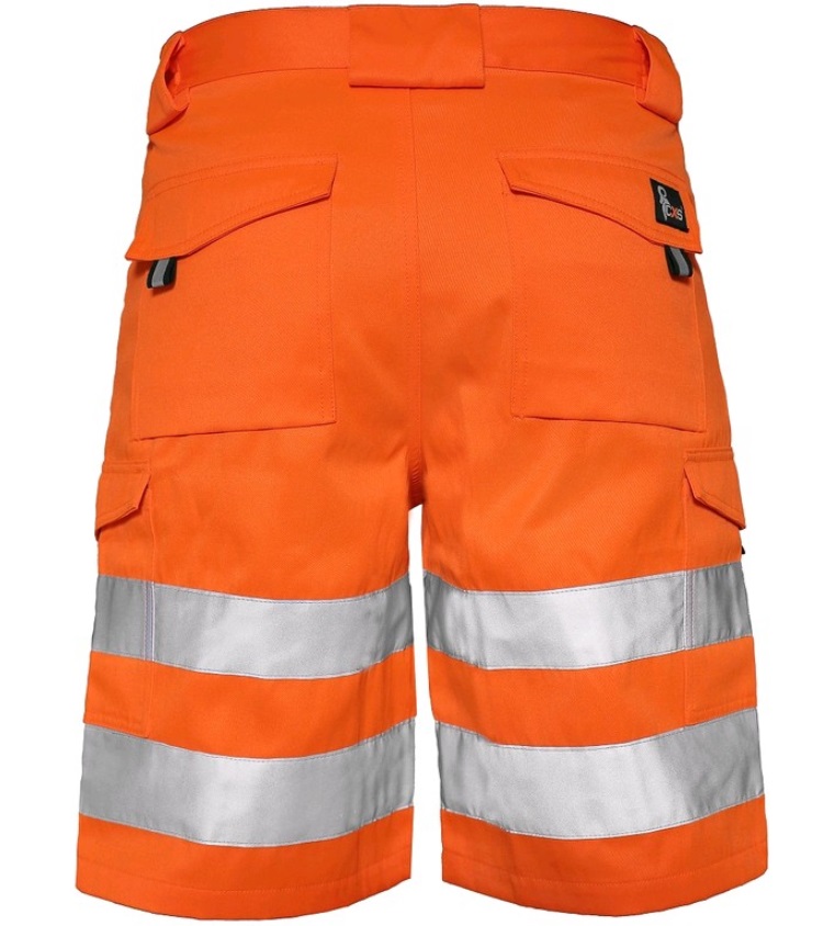 Pánské výstražné kraťasy, pas s poutky na opasek a gumou v bocích, přední klínové kapsy, zadní kapsy s klopou na suchý zip, boční kapsy s klopou na suchý zip, levá boční kapsa rozdělena na dvě komory.