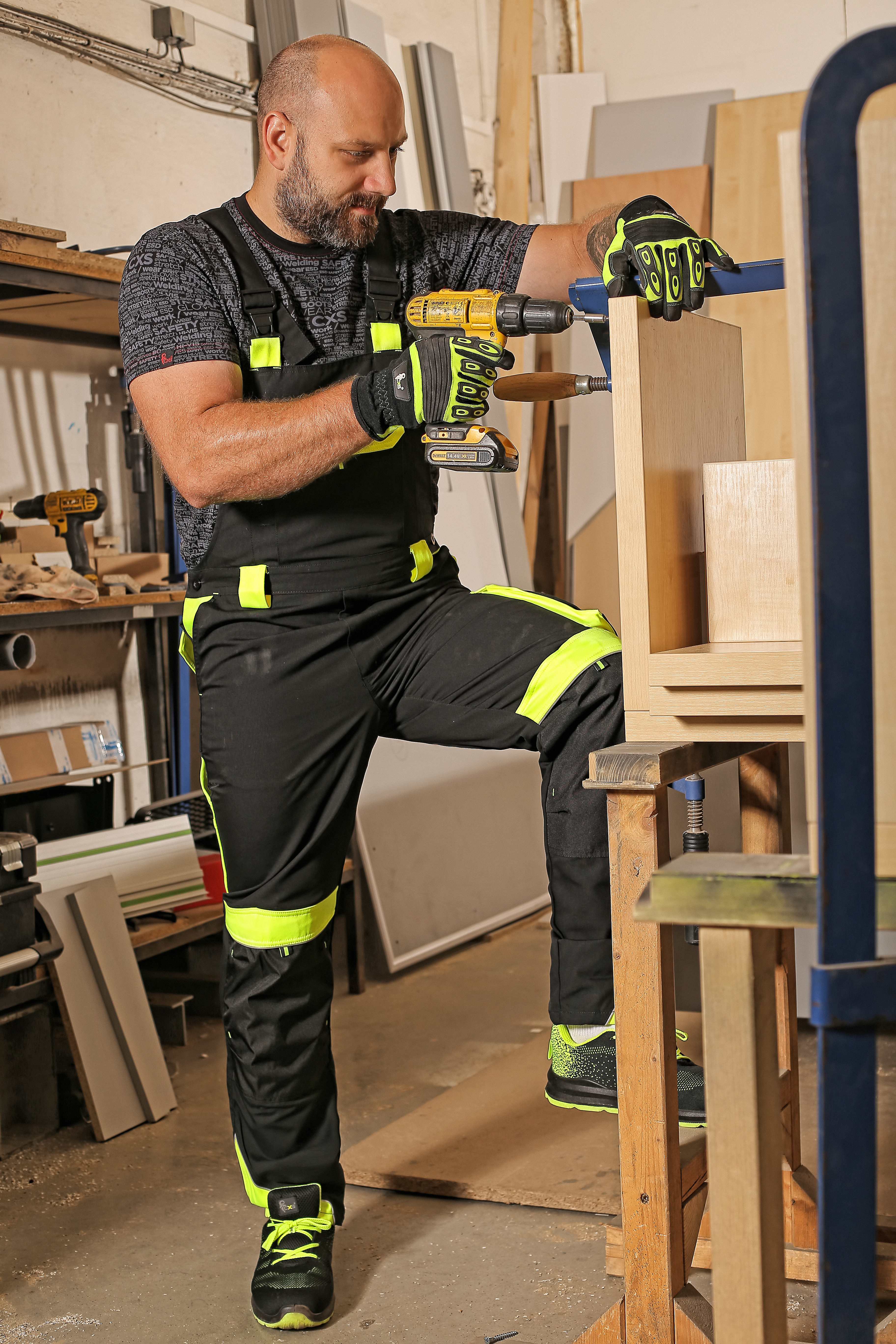 Pánské zahradníky, zesílená kolena s možností vložení kolenních výztuh, pevný pas s poutky na opasek, přední klínové kapsy, zadní kapsy s klopami, boční multifunkční kapsy, náprsenka s kapsou, reflexní doplňky.