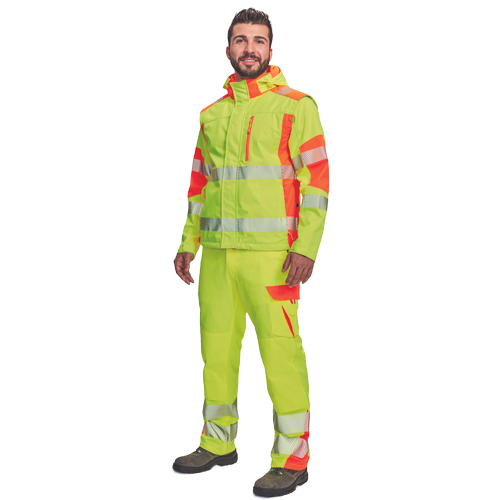 Kvalitní pánská prodyšná softshellová bunda s odepínatelnými rukávy; dvoubarevné HI-VIS provedení; segmentované tištěné reflexními pruhy okolo boků a rukávů.