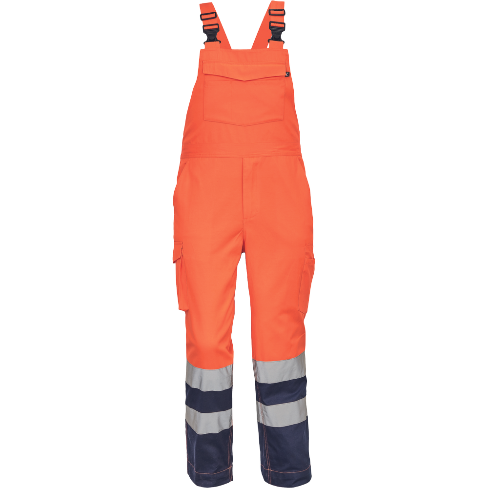 Pánské lehké HI-VIS pracovní kalhoty s laclem a reflexními pruhy na nohavicích, elastický pas; 2 boční kapsy, 1 kapsička na mince; 2 multifunkční stehenní kapsy, 2 zadní kapsy; 1 velká multifunkční náprsní kapsa.