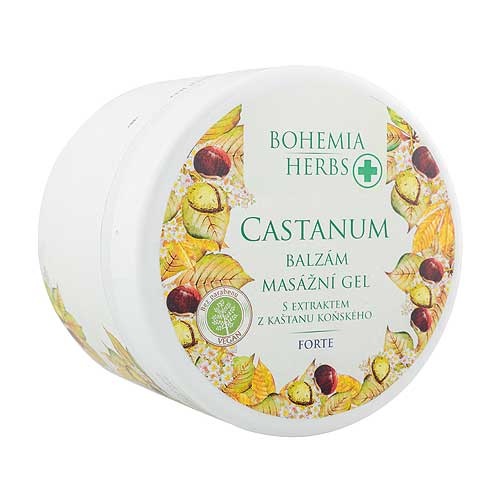 Masážní gel koňský kaštan – forte extra silný. Obsahuje kaštan koňský, kostival lékařský, arnika horská, jalovec obecný a další bylinné extrakty, které mají při vmasírování do pokožky příznivé účinky v oblasti unavených svalů, kloubů a šlach..