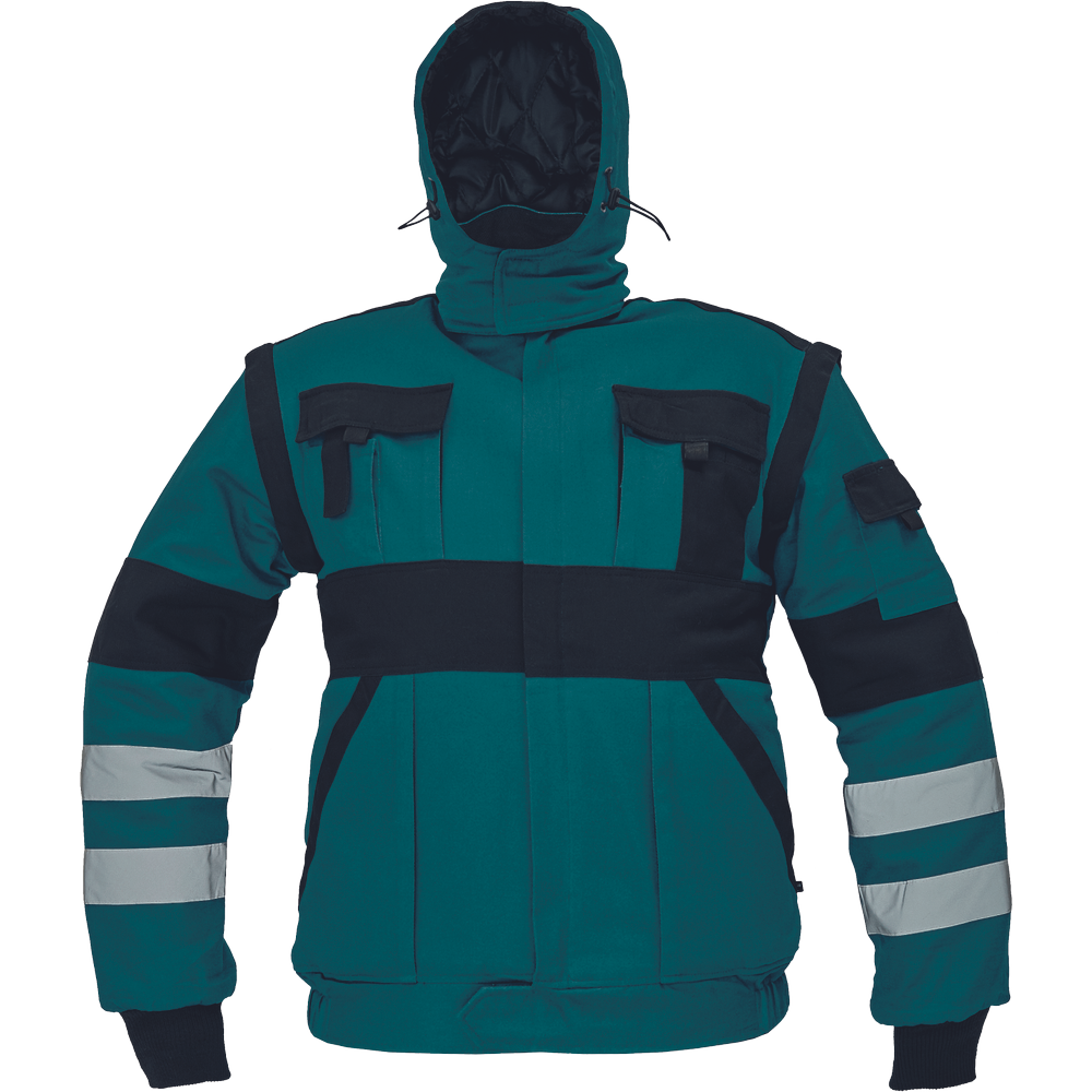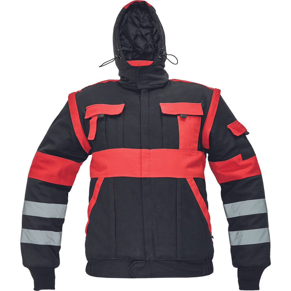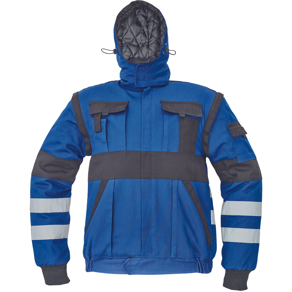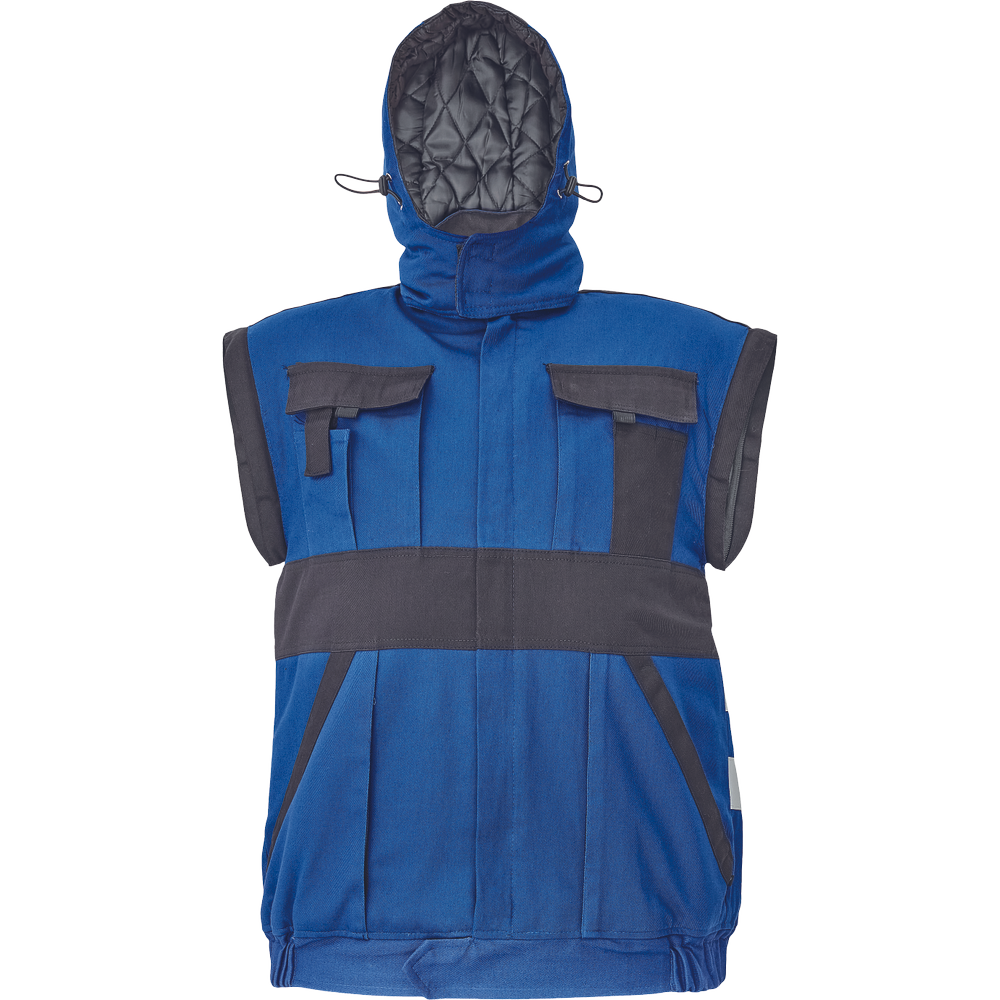 Zateplená bunda s elastickým pasem a odepínatelnými rukávy; zapínání na zip kryté légou; 2 přední kapsy, 2 zdvojené náprsní kapsy.