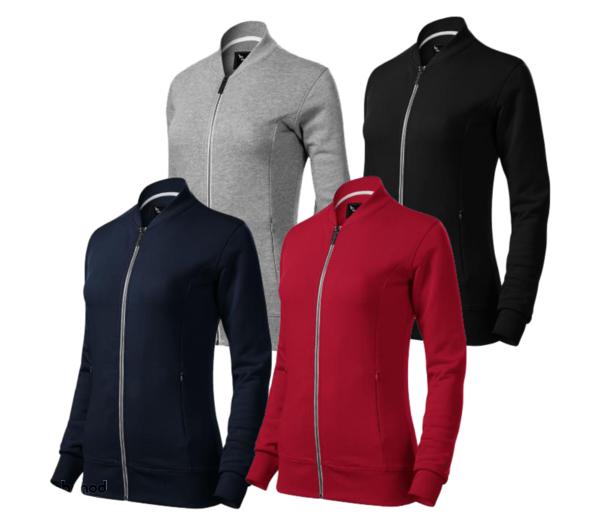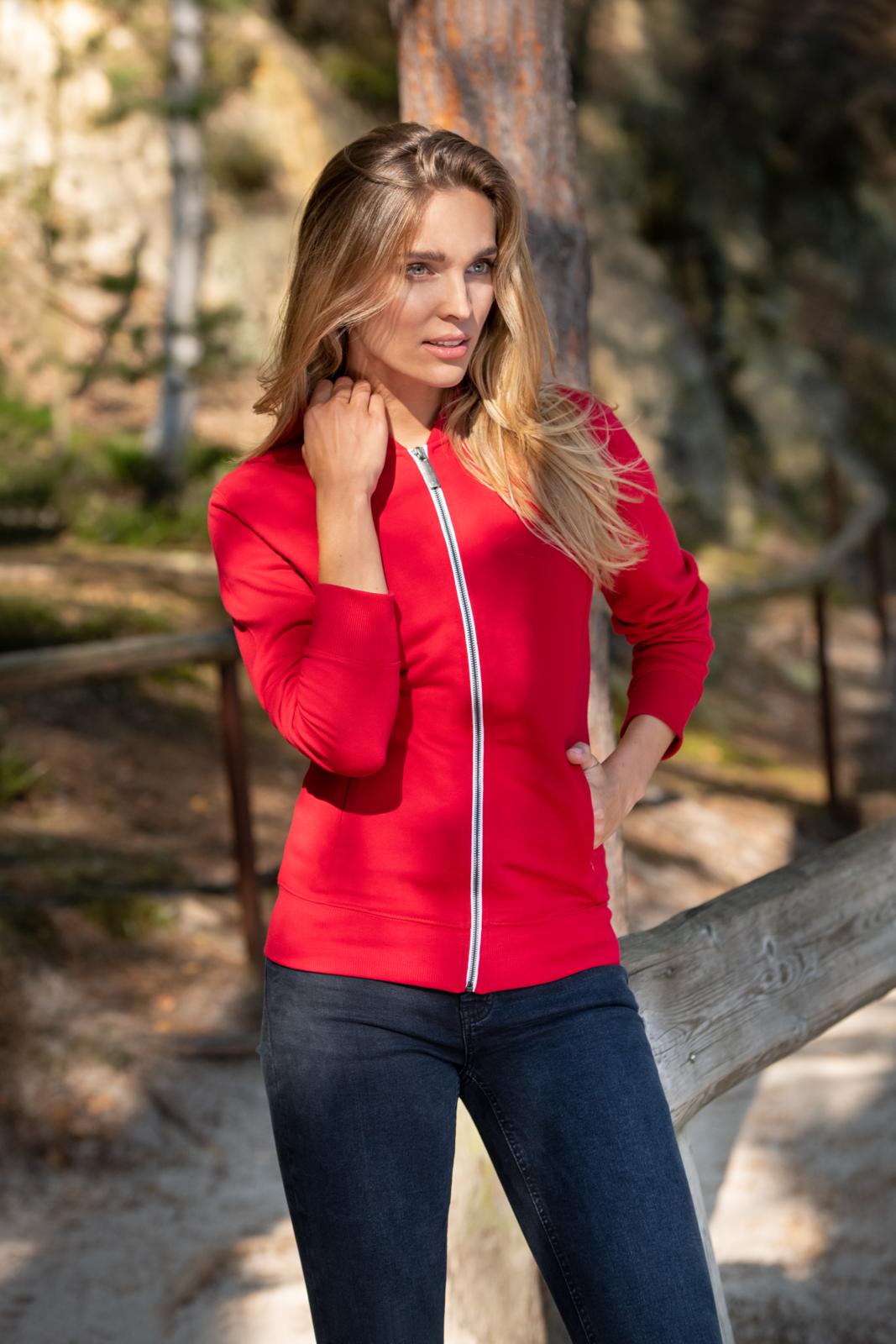 vnitřní část průkrčníku začištěna páskou, kapsy v členících švech se skrytým zipem, dolní lem a manžety rukávů z žebrového úpletu 2:2 s 5 % elastanu