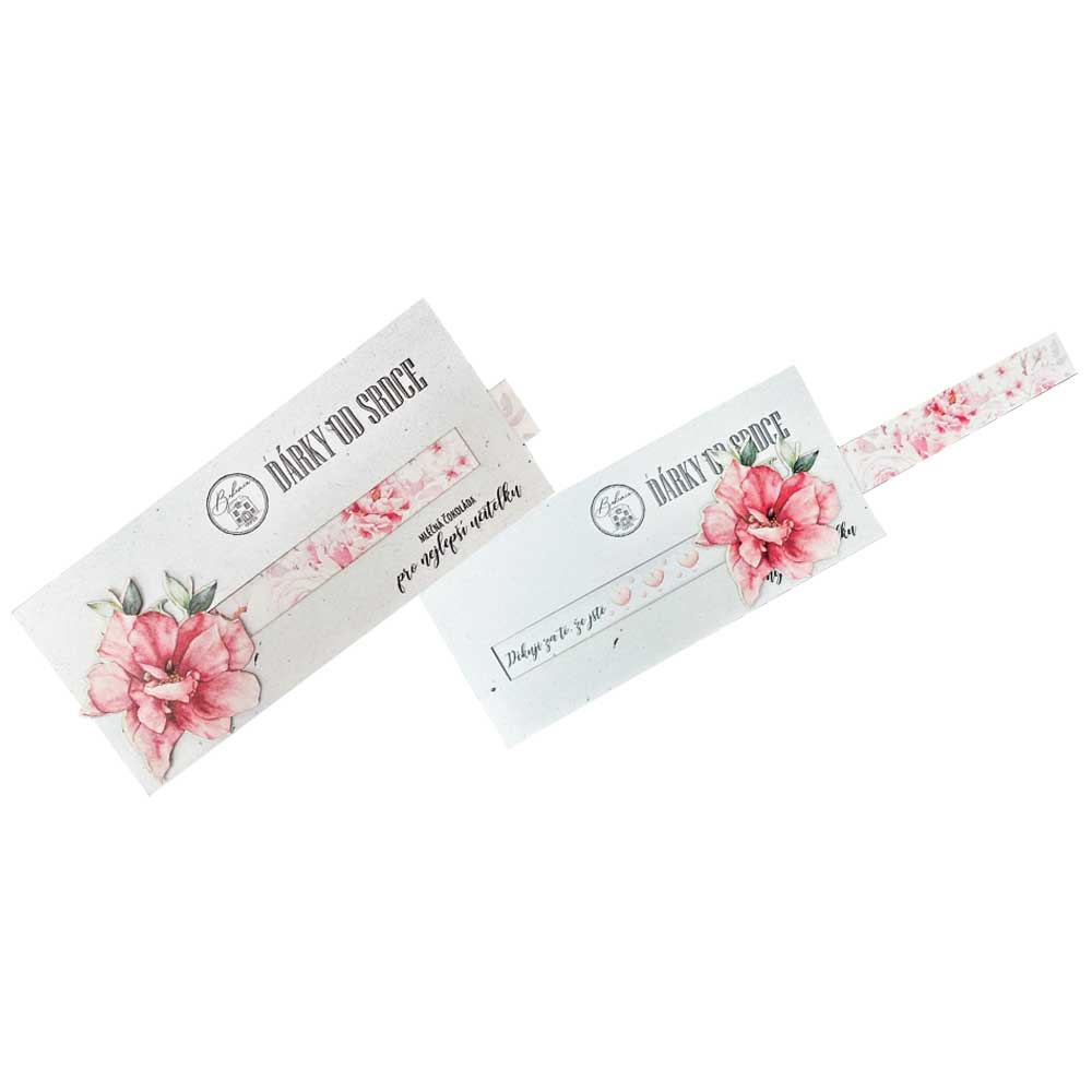 Čokoláda je opravdový dárek od srdce. Speciální obal má interaktivní část, kde se po zatažení objeví skrytý nápis „děkuji za to, že jste …“.
