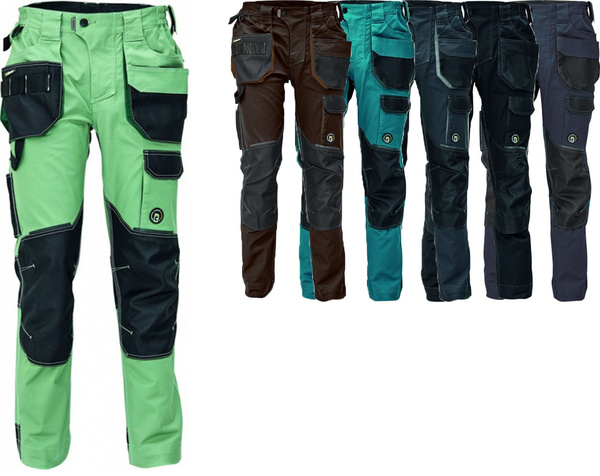 Pracovní kalhoty, elastický inovativní materiál TRIFIBETEX, ergonomický střih, snížený pružný pas, odolné trojité prošití nohavic a sedu, zesílená kapsa na nákoleníky.