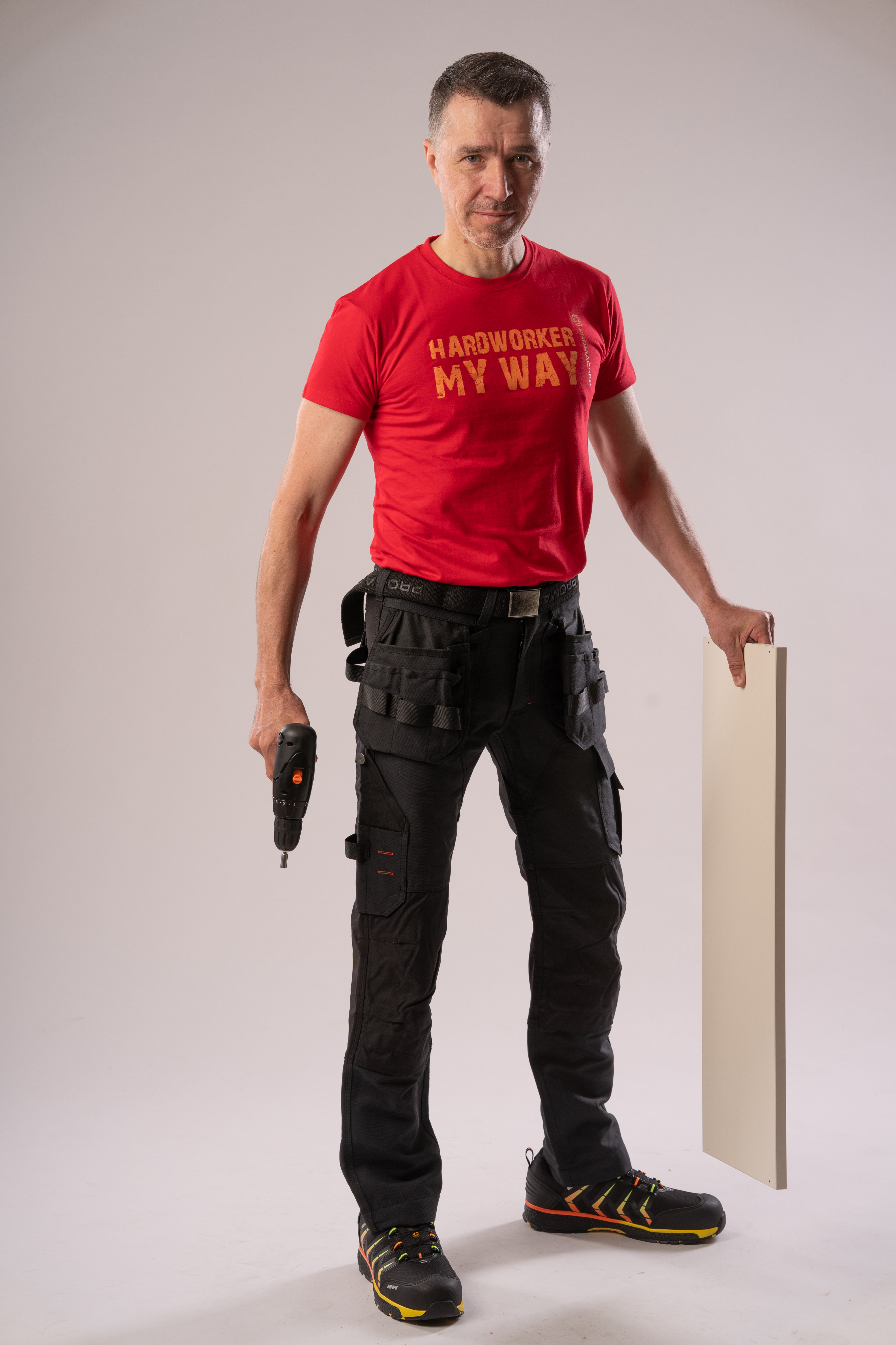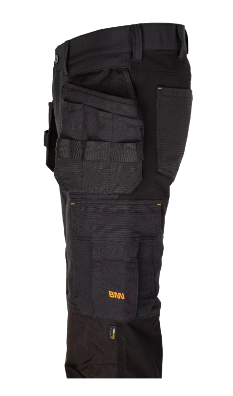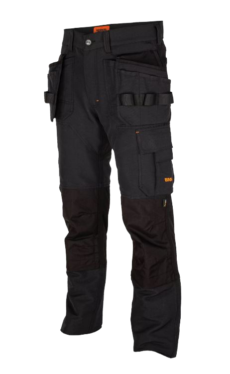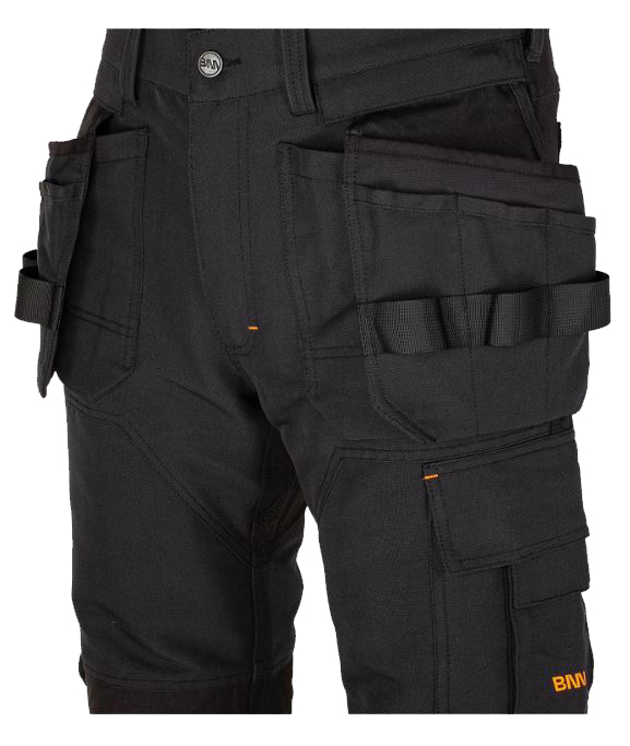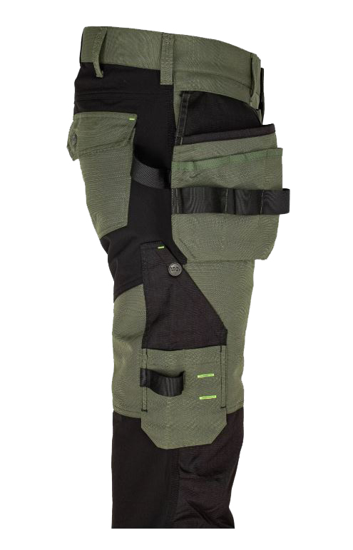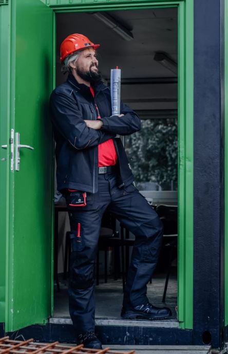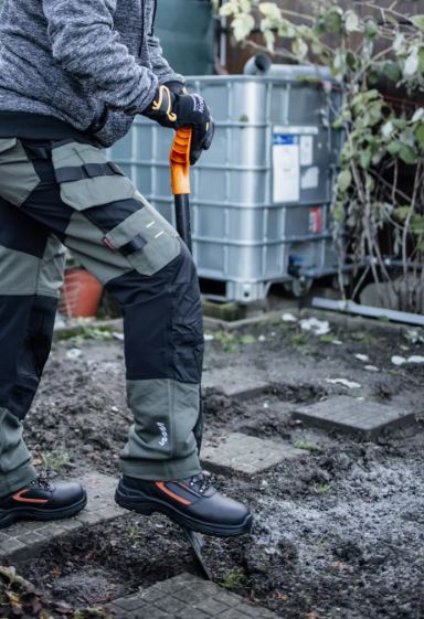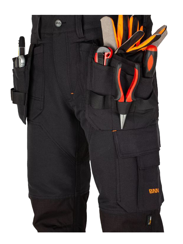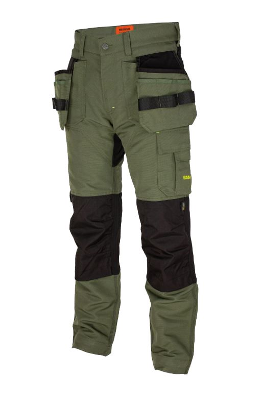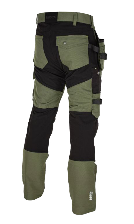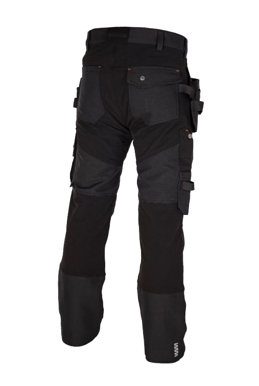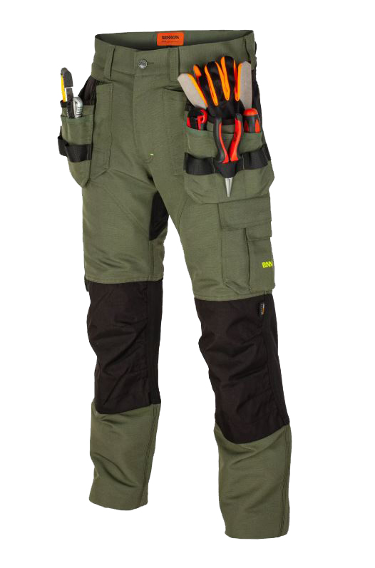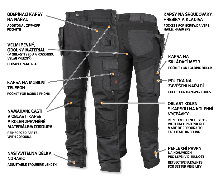 Montérky jsou opatřeny vodoodpudivým zátěrem a reflexními prvky na nohavicích, což zvyšuje bezpečnost a viditelnost při práci v horších světelných podmínkách. Odepínací kapsy na nářadí, kapsy na šroubováky, hřebíky a kladiva a poutka na zavěšení nářadí zajišťují snadný a rychlý přístup k nástrojům.