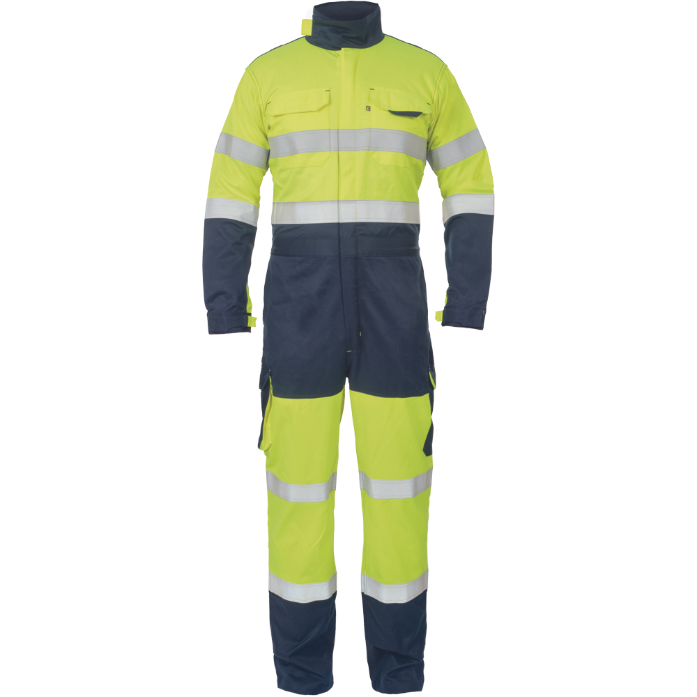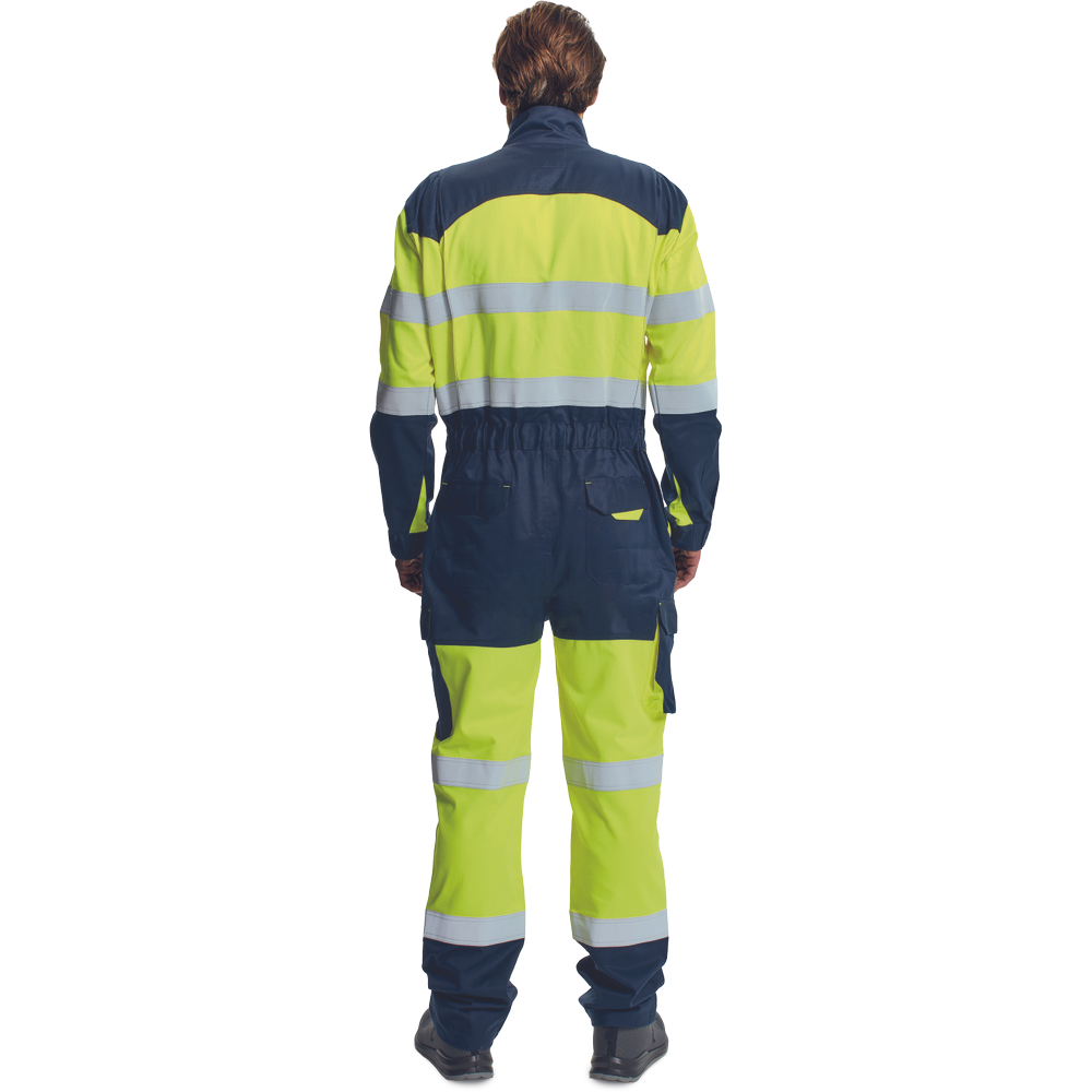 HI-VIS multinormní kombinéza s elastickým pasem; zapínání na zip kryté légou na suchý zip; 2 boční kapsy; 2 stehenní kapsy s klopou na suchý zip; 2 náprsní kapsy na suchý zip; 2 zadní kapsy na suchý zip; dvojice 5 cm šitých reflexních pruhů okolo rukávů, boků a lýtek; elastické manžety rukávů se suchým zipem; nastavitelná délka nohavic.