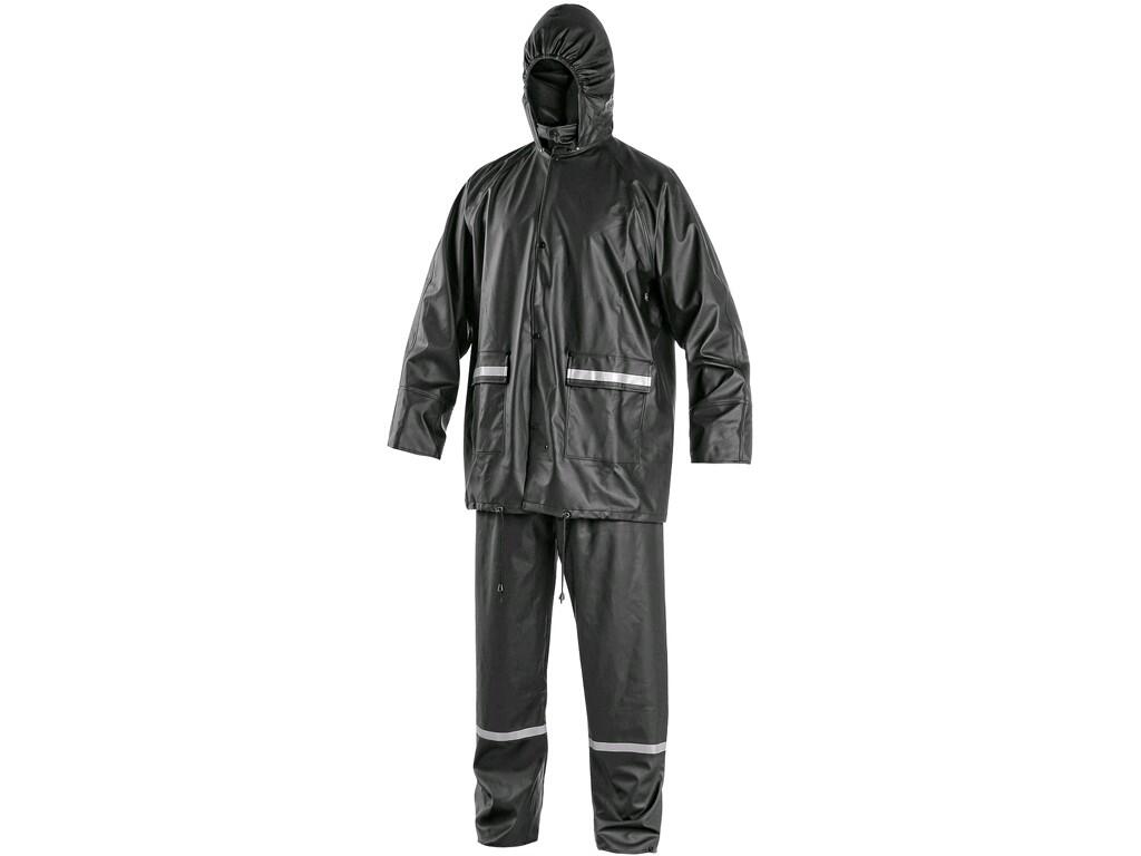 Nepromokavý oděv do deště s kapucí v límci a reflexními doplňky. Zapínání na zip a druky, vnitřní manžety v rukávech do gumy, stahování v dolním okraji, větrání na zádech a v podpaží, kalhoty v pase do gumy.