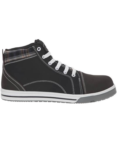 Bezpečnostní obuv DERRICK může plně vyhovět podmínkám provozu i modernímu stylu oblékání. Základní plochu šedé a hnědé atraktivně narušují bílé tkaničky a prošití v části šněrování.