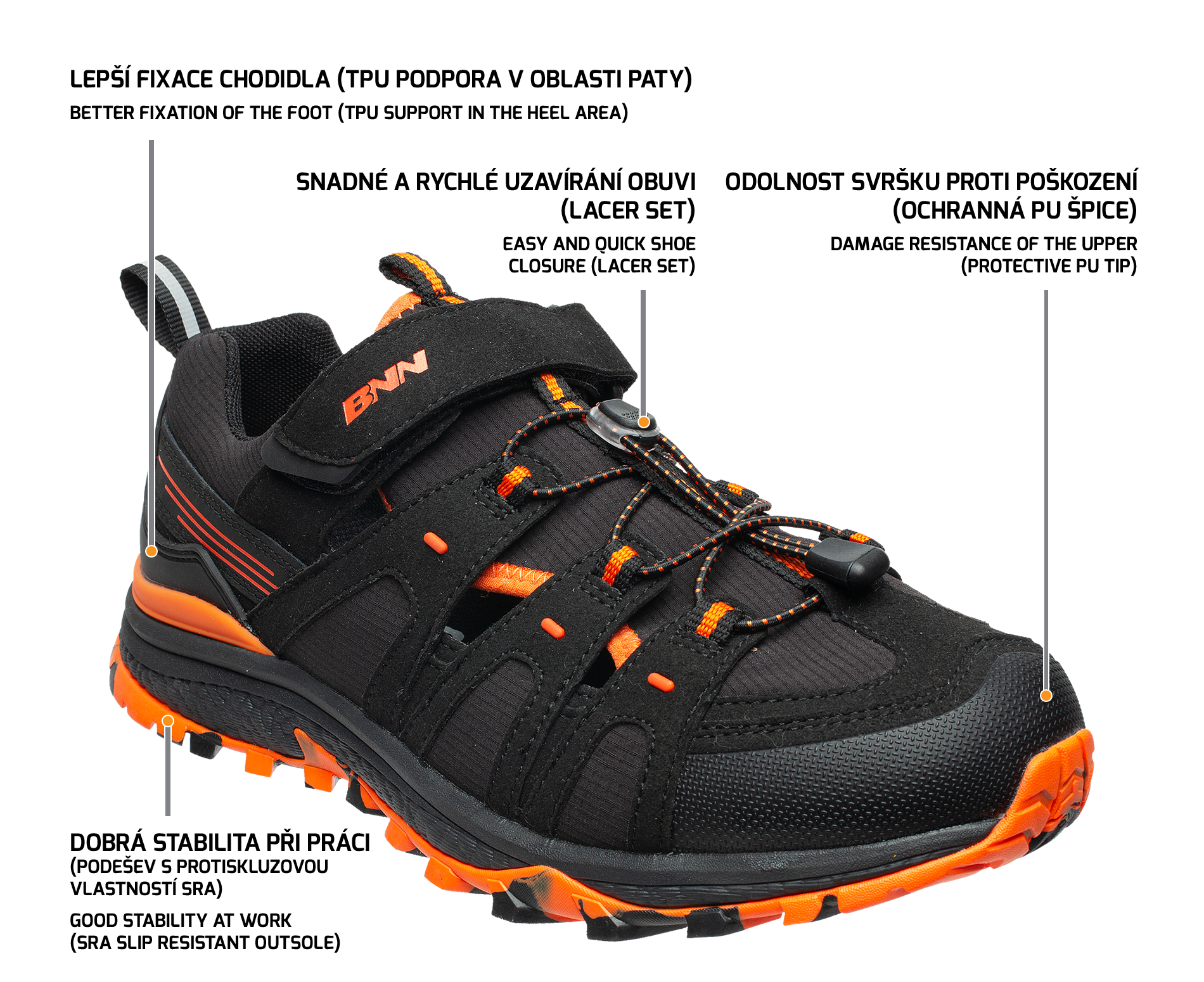 Pracovní sandál moderního sportovního vzhledu, který nalezne uplatnění nejen v práci, ale i při běžném nošení ve volném čase.