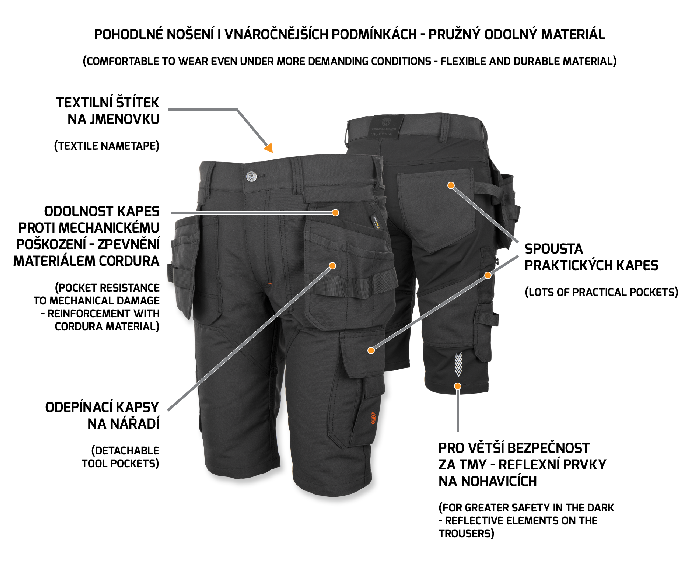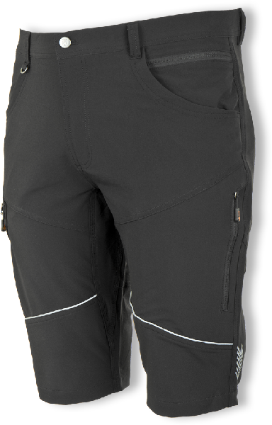 Outdoorové strečové kraťasy. Pevný strečový materiál, kvalitní trojité prošití na namáhaných místech. Reflexní prvky na nohavicích pro lepší viditelnost. 2 kapsy na předním díle nohavic, kapsy na zip na předním a zadním díle, elastický pas.
