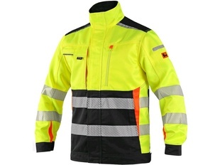 Pánská výstražná blůza, ramena zesílena materiálem CORDURA, rukávy s nastavitelnou manžetou na suchý zip, kryté zapínání na zip, suché zipy a druky, levá náprsní kapsa na zip, pravá krytá klopou, na levém rukávu kapsička na tužky, boční kapsy na zip, segmentované reflexní pásky (šíře 5 cm), kontrastní oranžové a reflexní doplňky. Doporučené použití: stavebnictví, silničáři, údržba, logistika, letecká a lodní doprava.