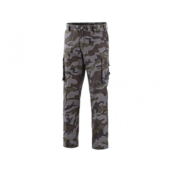 Pánské maskáčové kalhoty s hydrofobní úpravou, flexibilní pas s poutky na opasek, přední kapsy, zadní kapsy s patkou na suchý zip, boční multifunkční kapsy - vlevo skrytá zipová kapsa. Použití pro volný čas i práci.