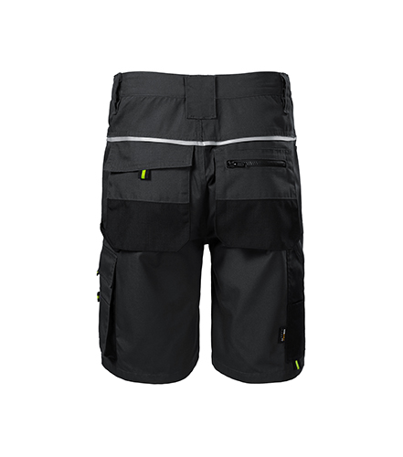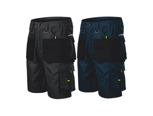 Retroreflexní páska na zadním dílu. Multifunkční kapsy. Pruženka v boční části pasového límce. Zdvojená sedová část pro zvýšení odolnosti. Poutko na kladivo.
