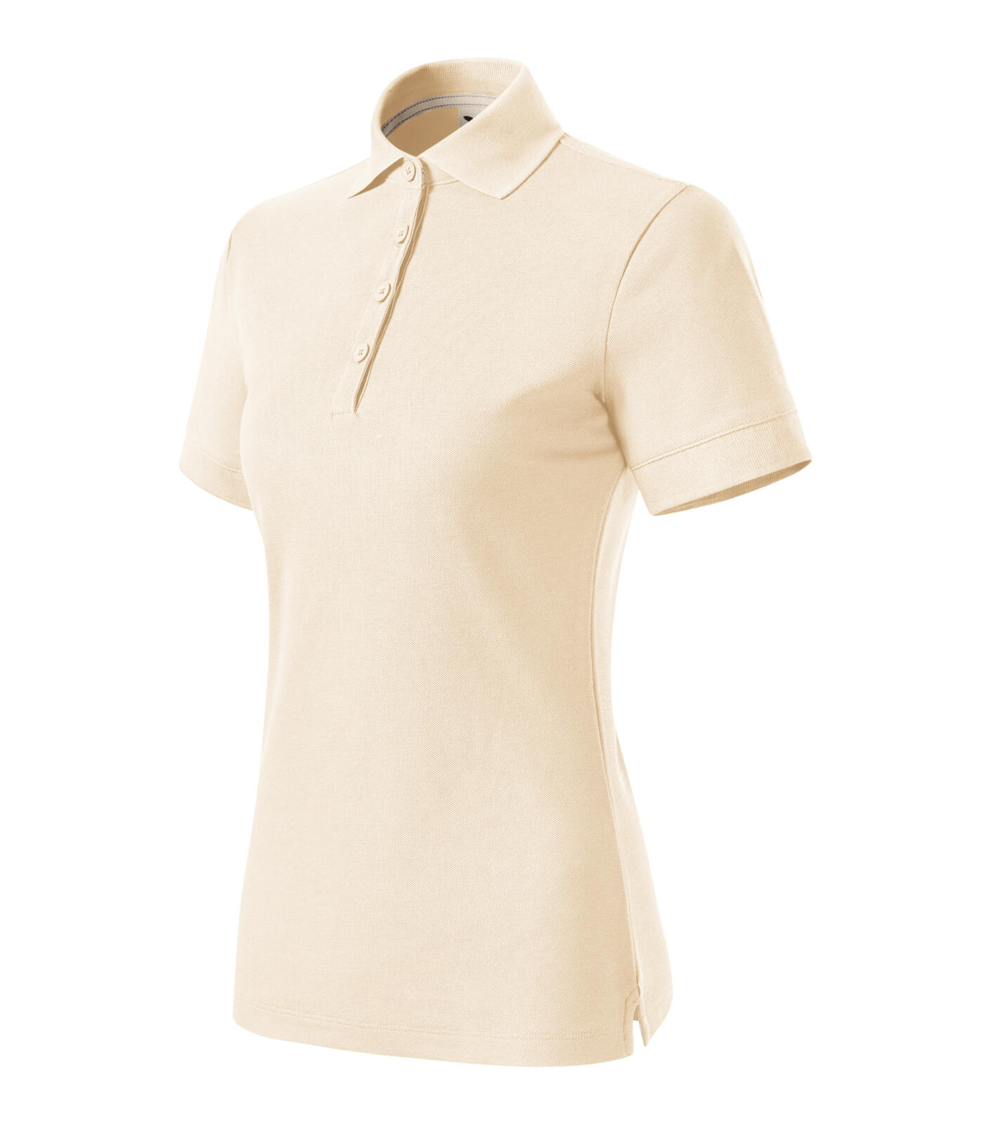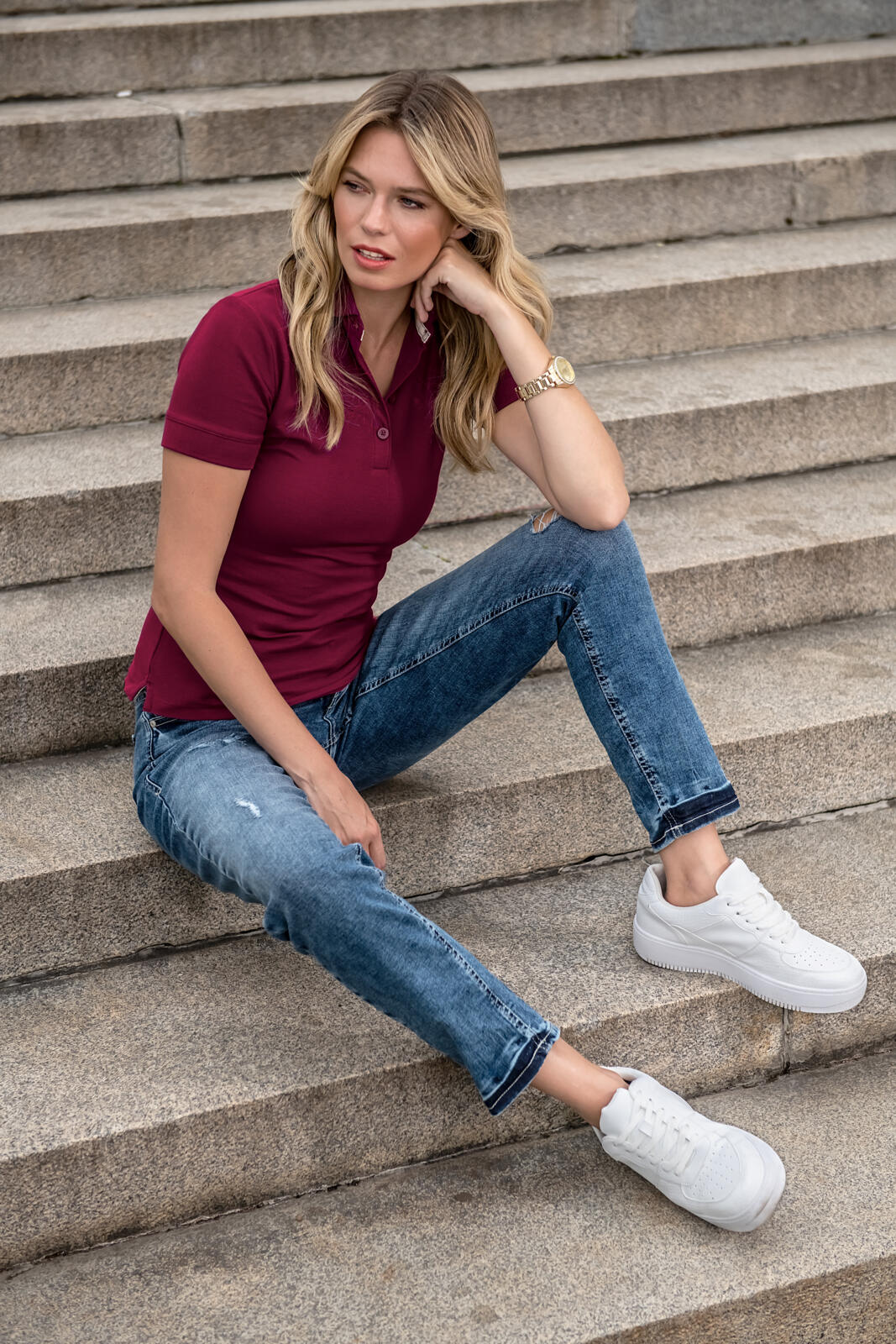 Tričko má lehce vypasovaný střih s bočními švy, který zdůrazňuje ženské křivky a zaručuje pohodlné nošení. Límeček je zdoben dvojitým reliéfním proužkem z žebrového úpletu 1:1, který dodává tričku moderní vzhled.