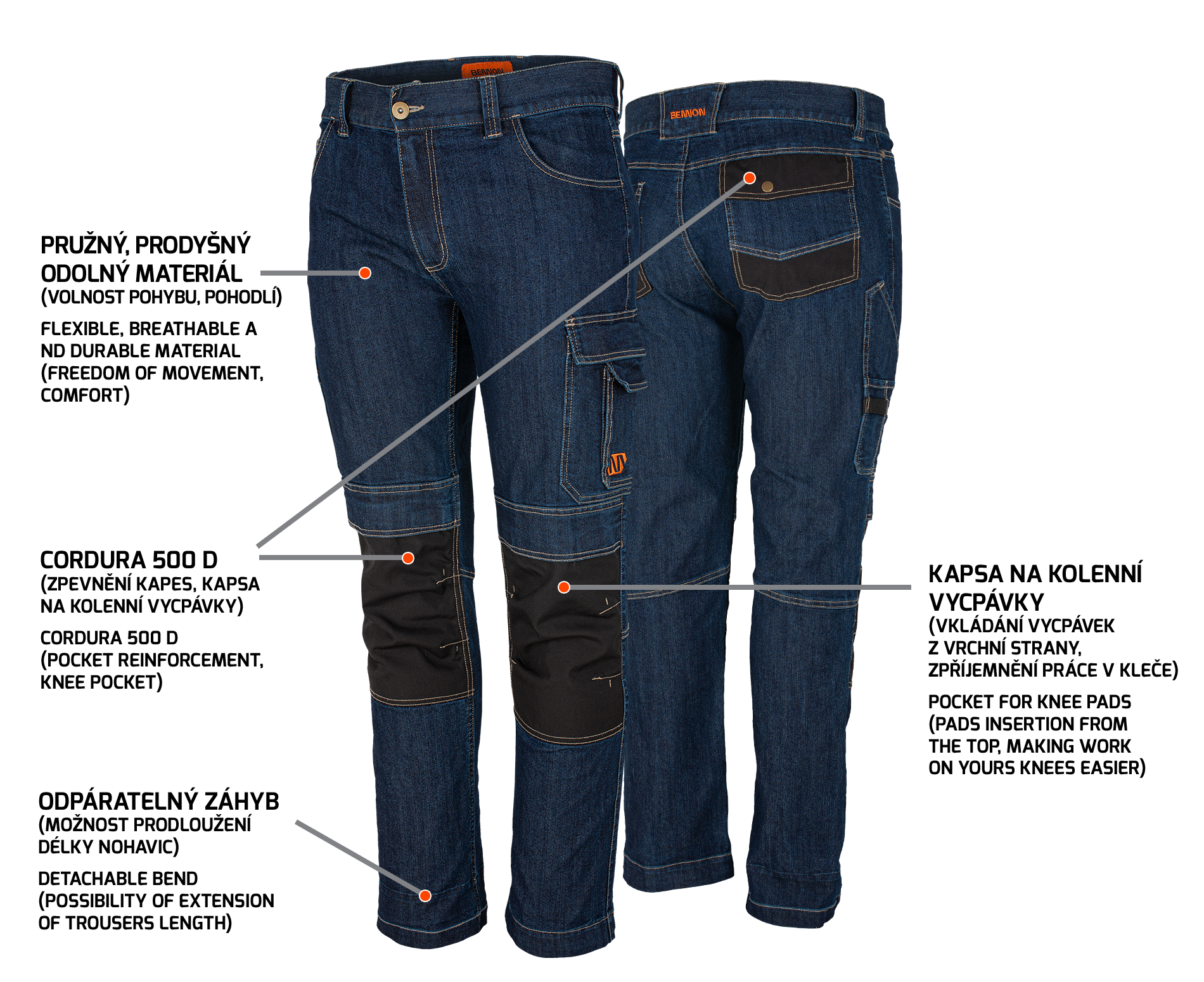 Velmi pohodlné pracovní džínové kalhoty ušité z odolného, prodyšného a navíc i velmi pružného materiálu, takže je jejich nošení maximálně příjemné a umožňuje volný pohyb při práci.